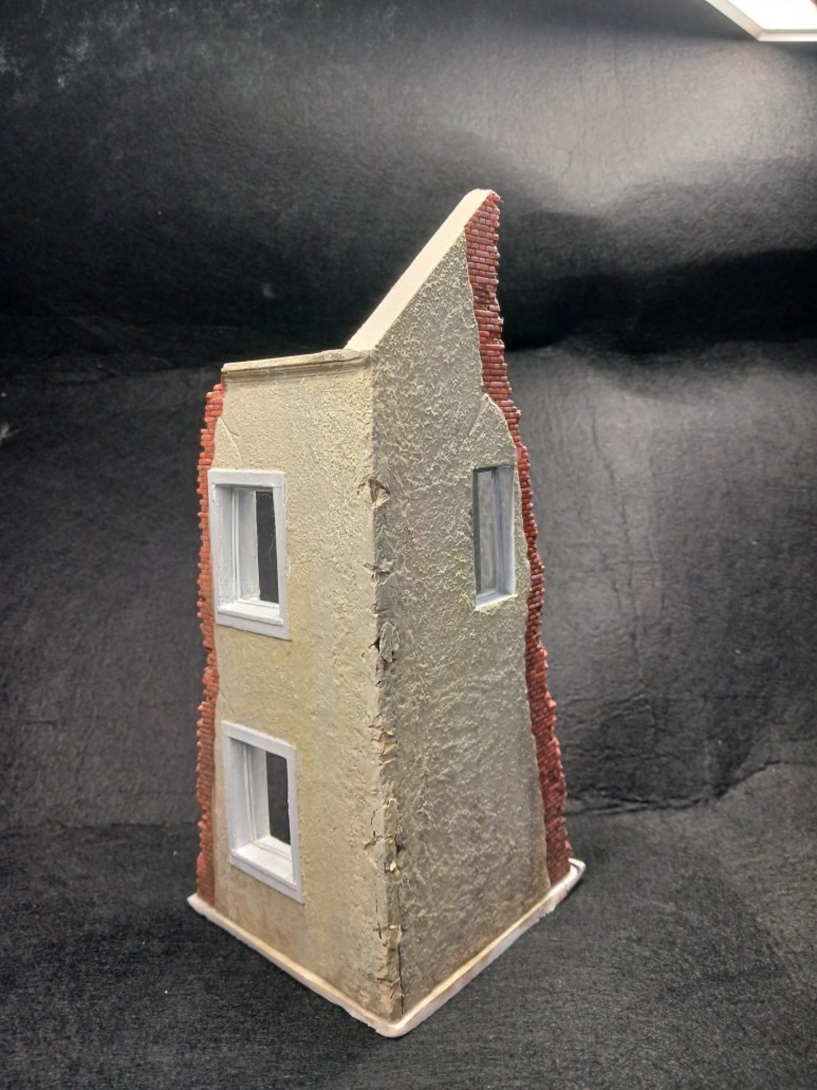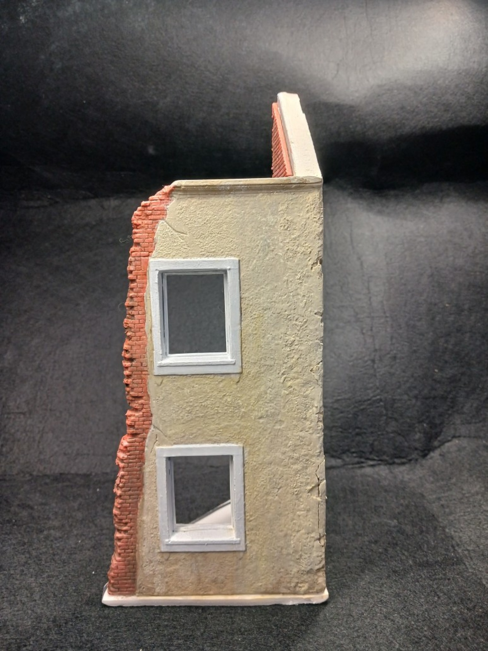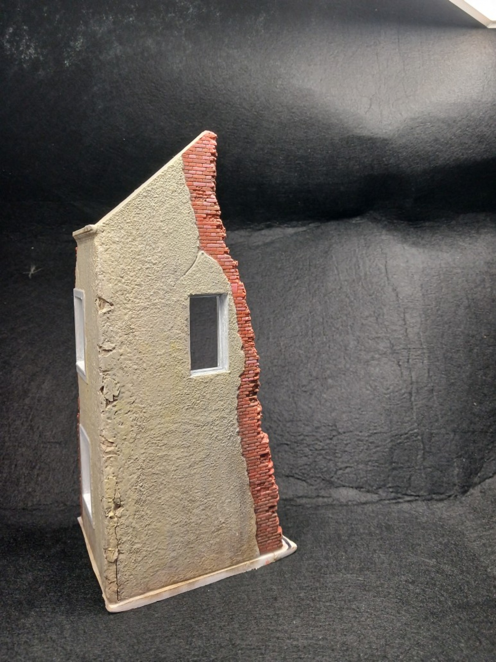 이 건물은 파괴되지 않은벽면은 미세한 요철이 있는데 모서리가 잘 안맞아서 에폭시 퍼티로 모서리를 메꿨습니다. 그리고 전체적으로 액체 퍼티를 바른후에 반쯤 굳을때 소금을 뿌렸습니다. 그리고 퍼티가 다 굳은후 물로 녹이면 소금만 녹습니다. 그러면 전체적으로 요철이 비슷해집니다.