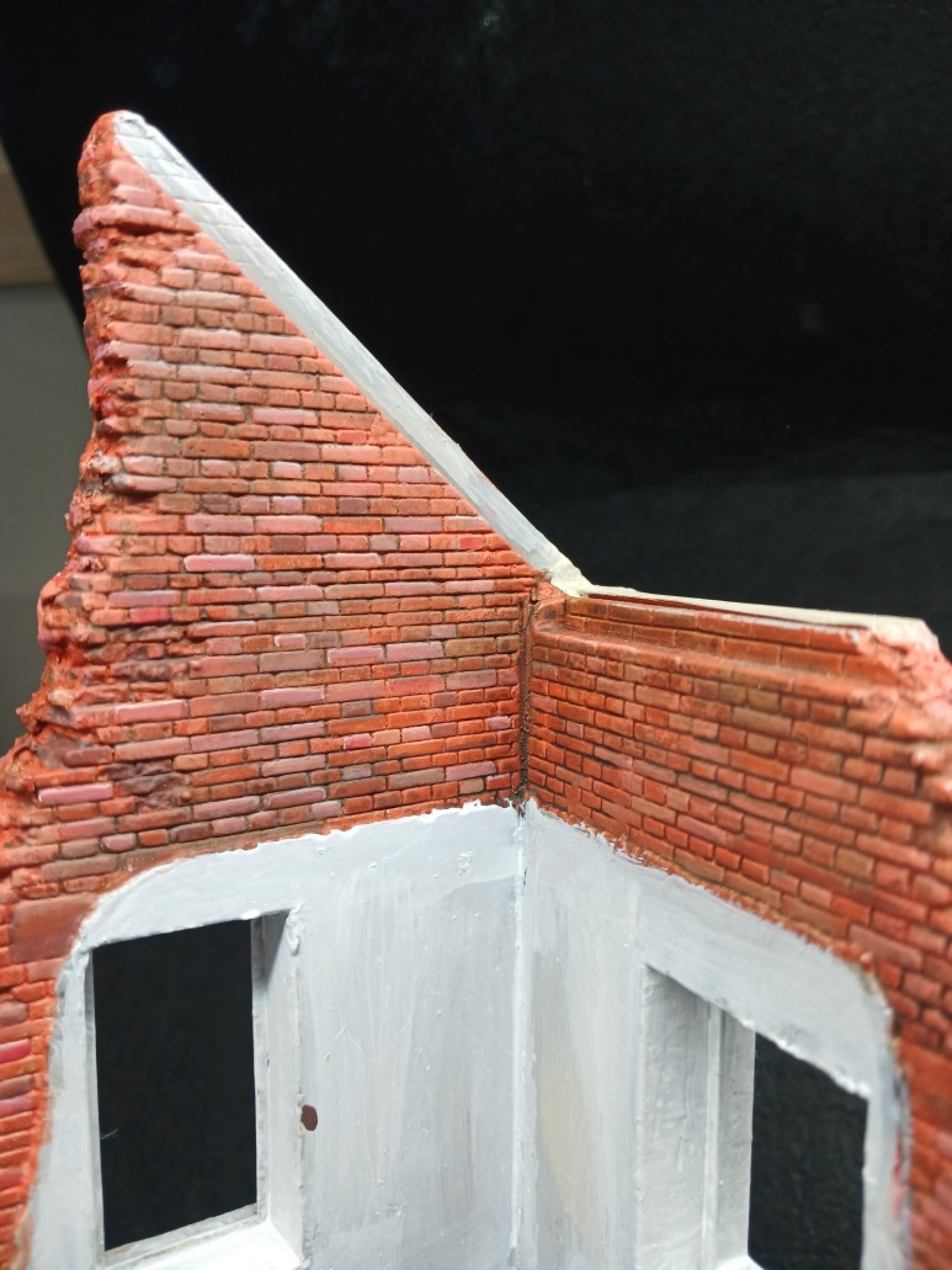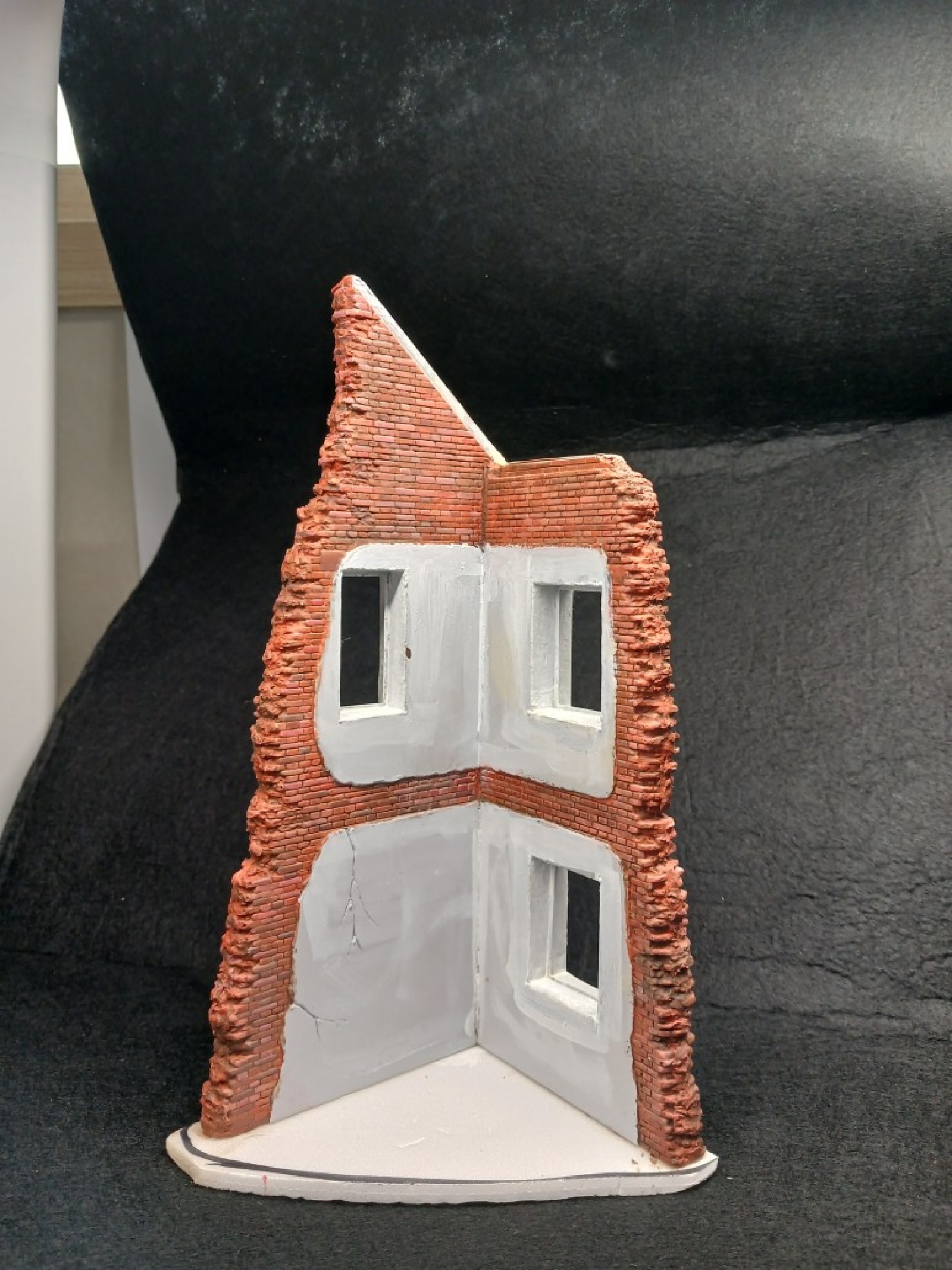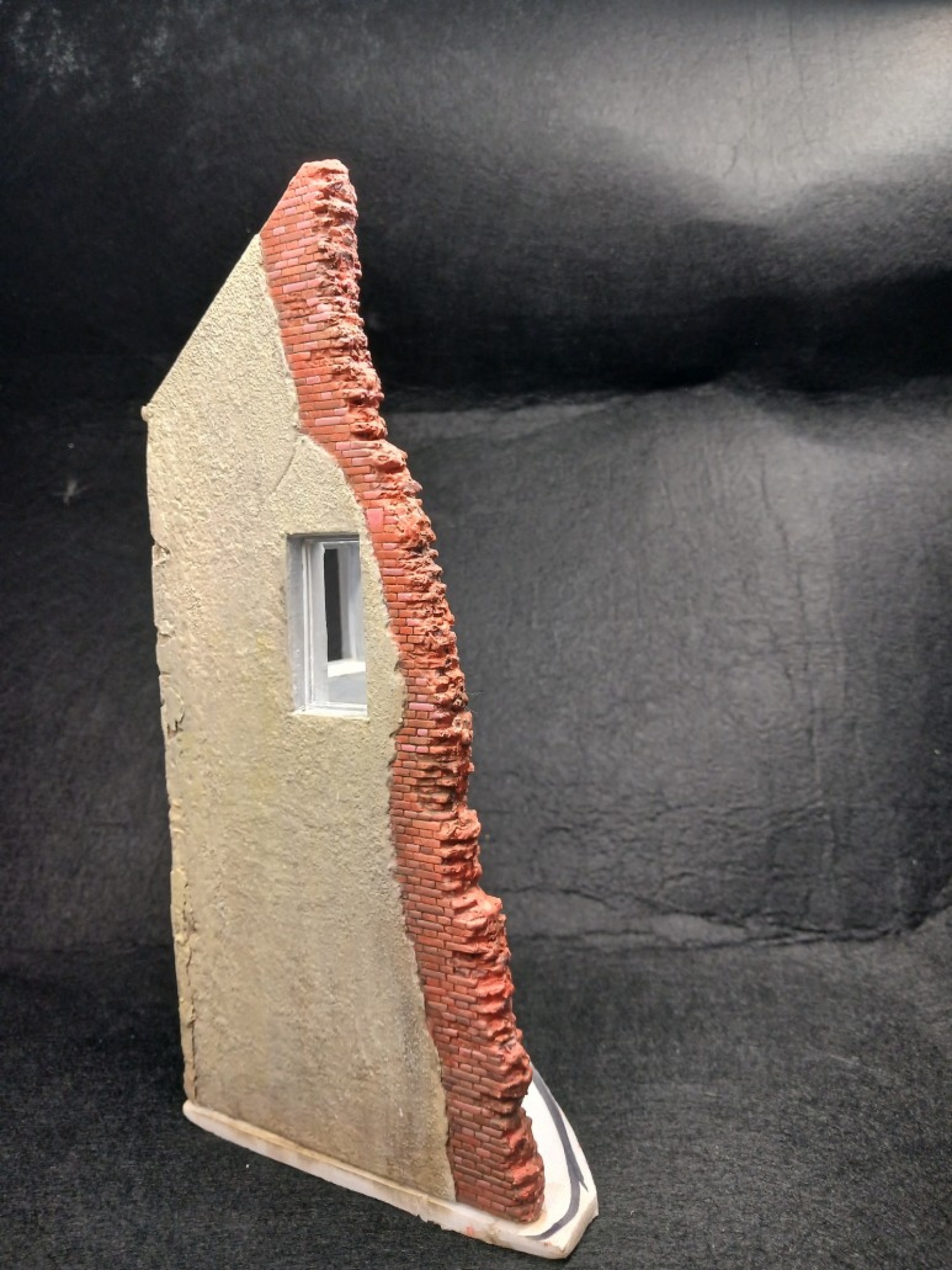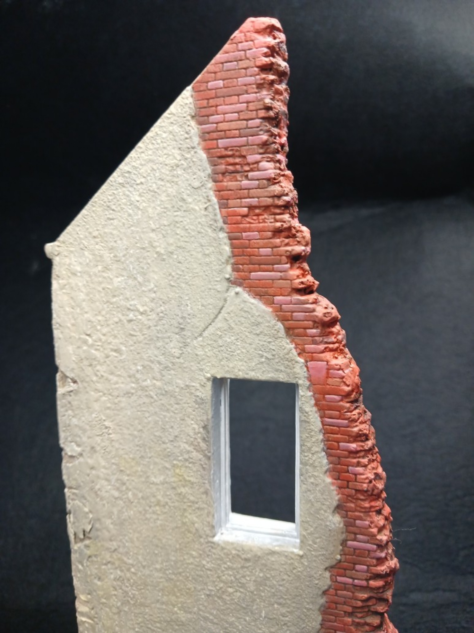 이 건물은 파괴되지 않은벽면은 미세한 요철이 있는데 모서리가 잘 안맞아서 에폭시 퍼티로 모서리를 메꿨습니다. 그리고 전체적으로 액체 퍼티를 바른후에 반쯤 굳을때 소금을 뿌렸습니다. 그리고 퍼티가 다 굳은후 물로 녹이면 소금만 녹습니다. 그러면 전체적으로 요철이 비슷해집니다.