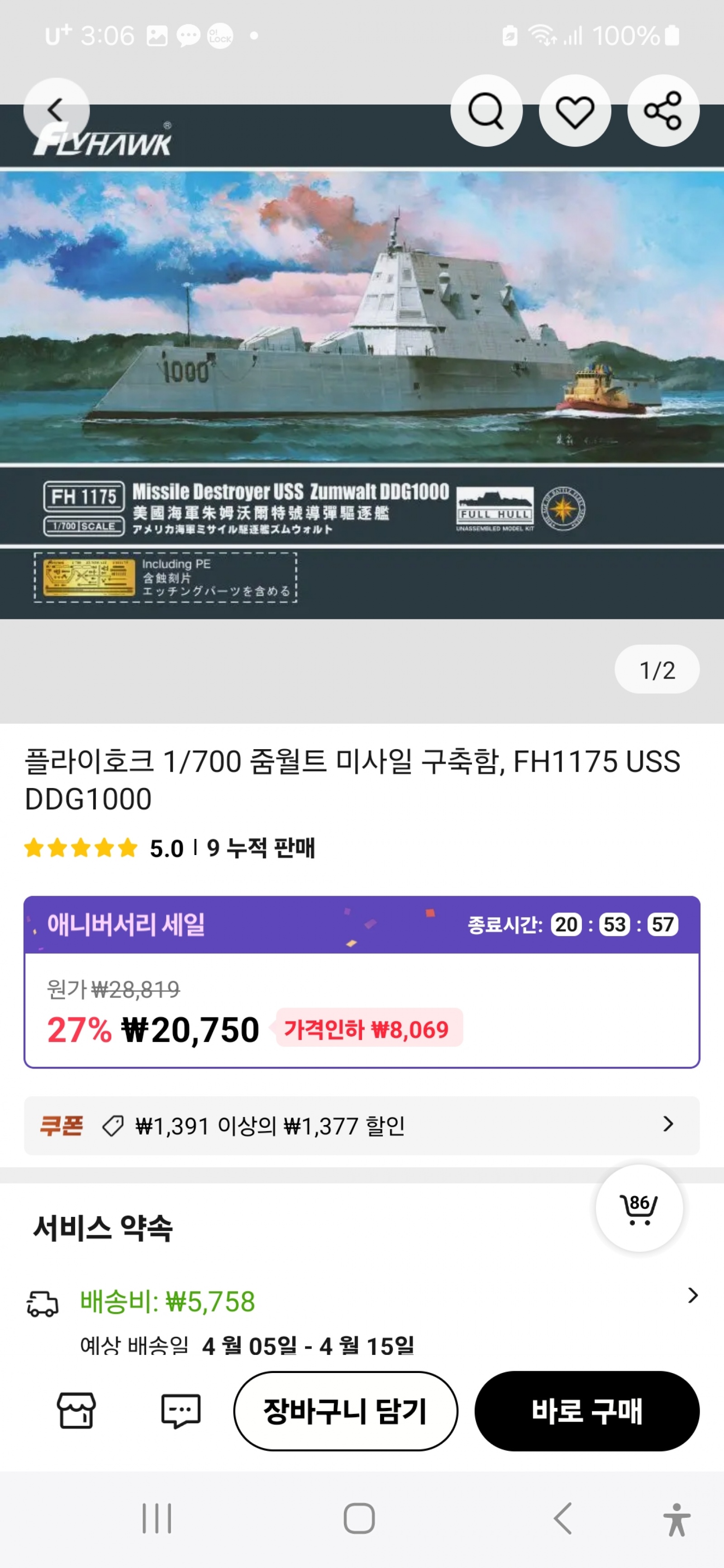 * 줌왈트 전투함은 아직 적응이.. 그래도 좋은 품질에 난간 등 에칭 모두 풀로 포함된 가격이 2만원이면 참 괜찮네요