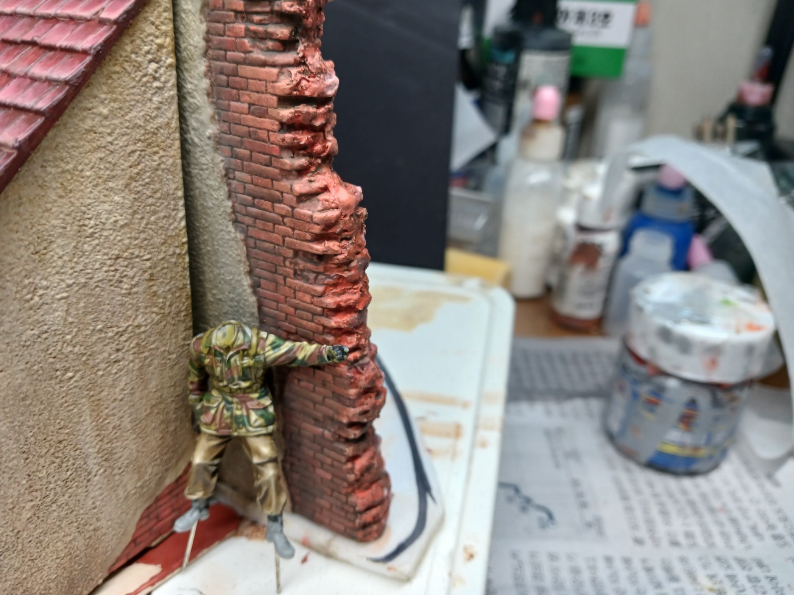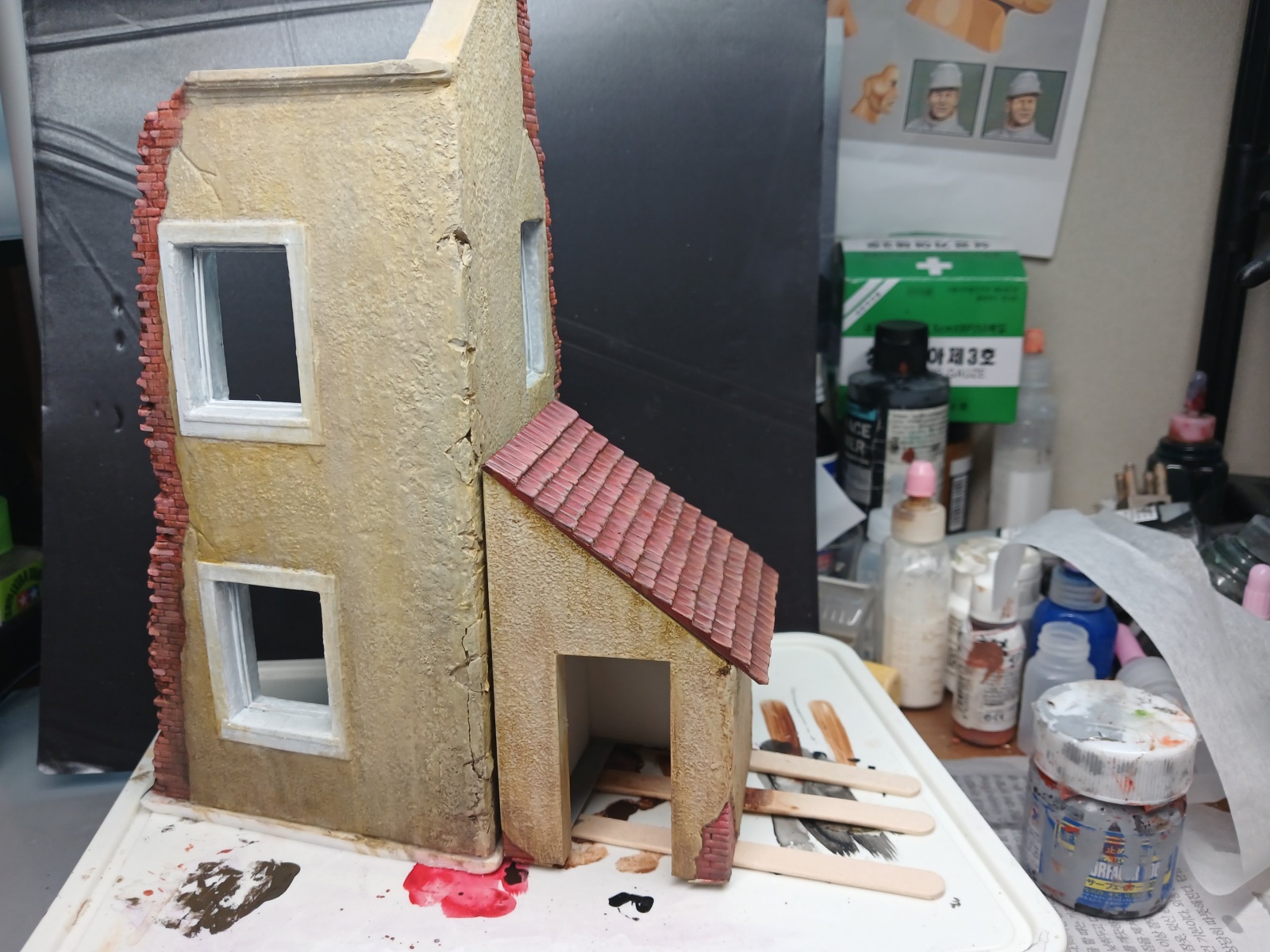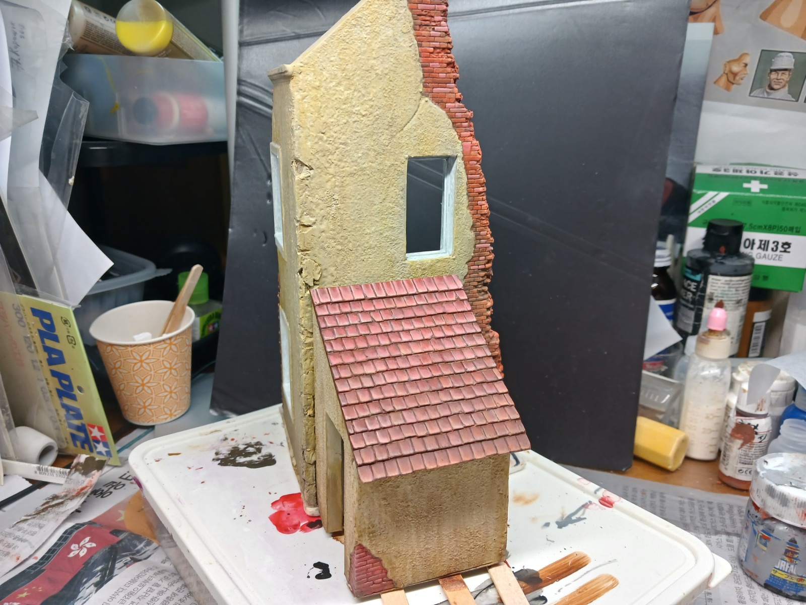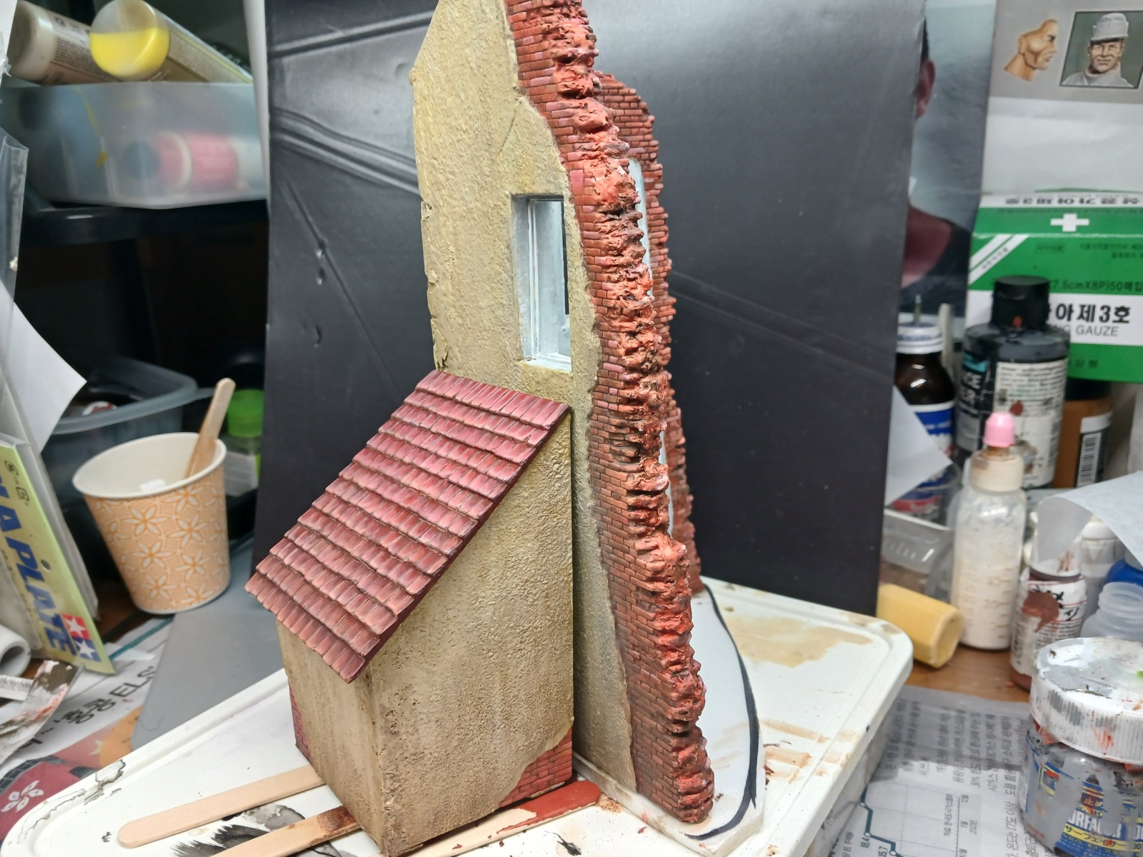 마켓가든작전 막바지 부상병들이 함락직전의 거점인 폐허가된 건물에 남고 벌을수있는 부상병들이 후퇴한다는 디오라마입니다 건물과 인형을 칠하고있습니다