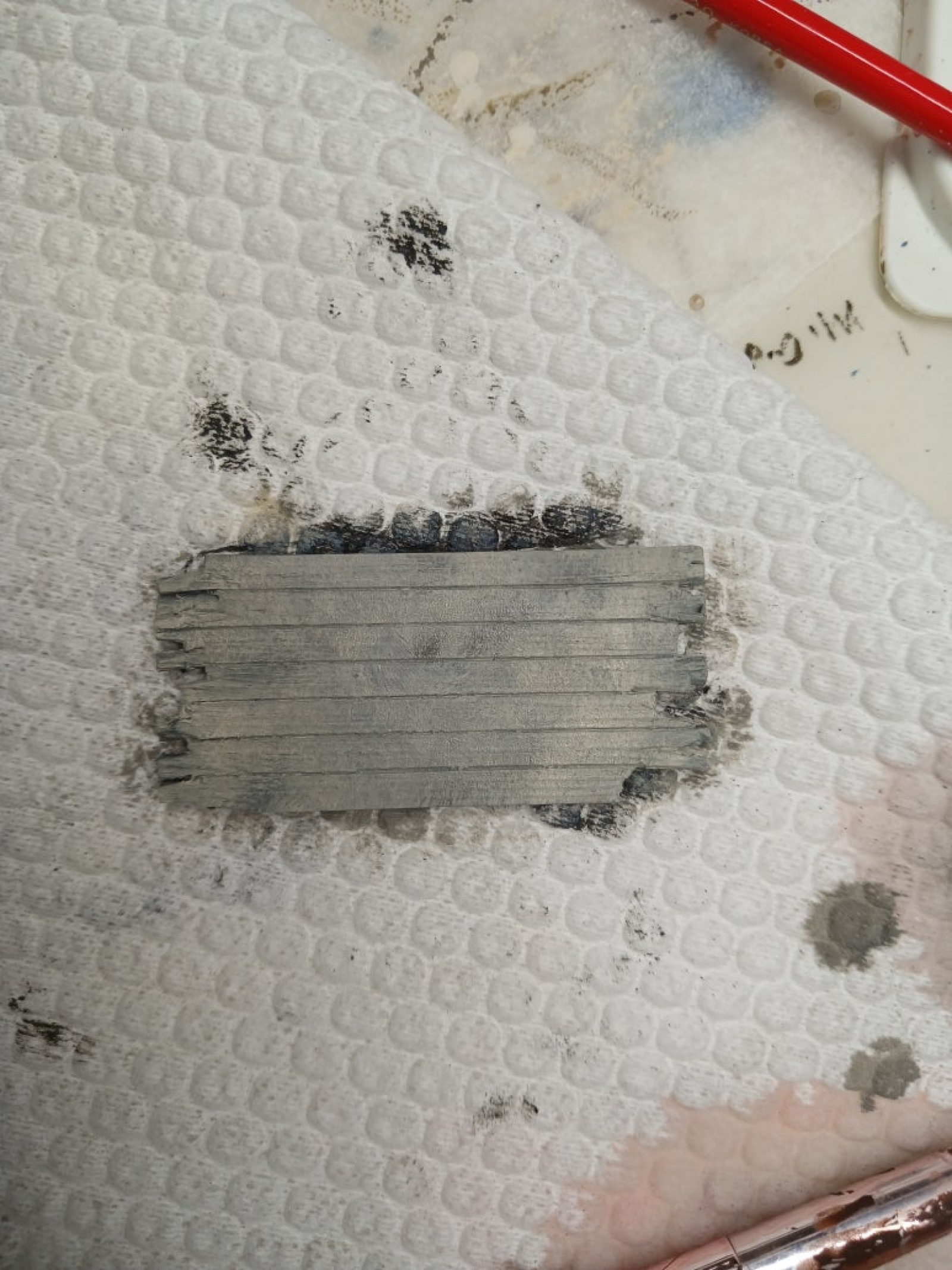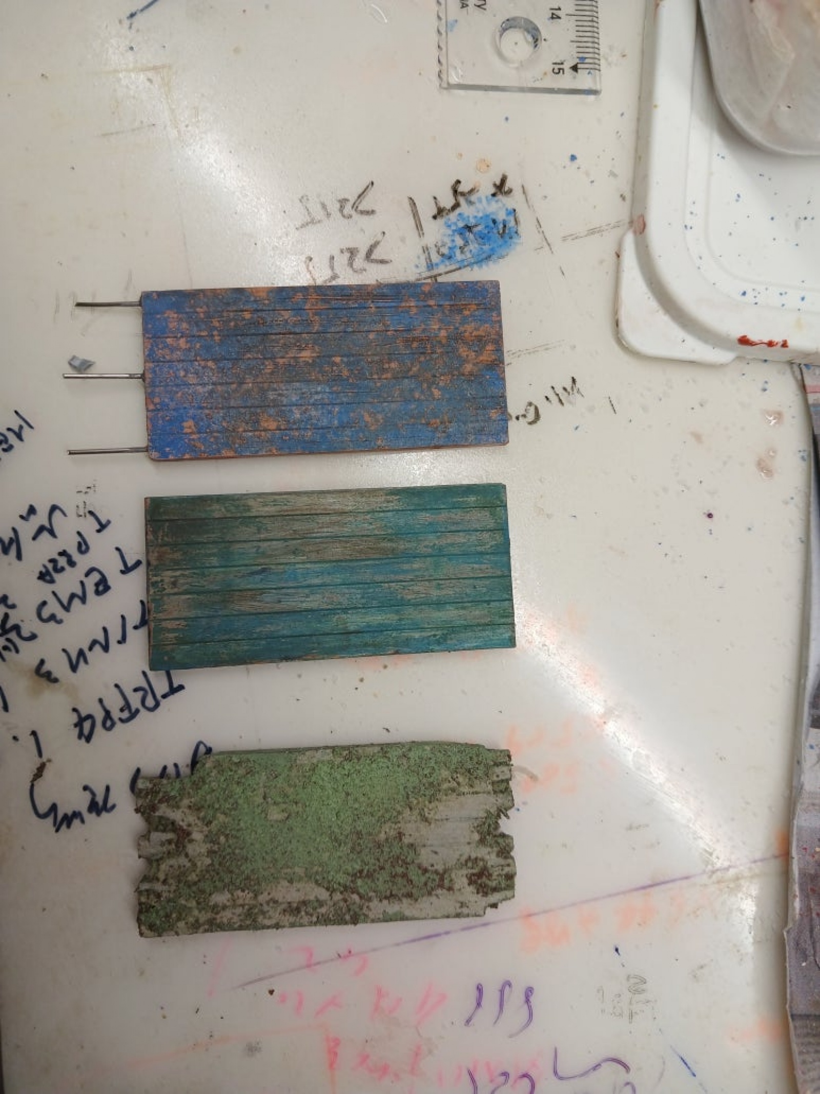연두색을 칠하고 벗겨냅니다. 옆의 두가지 문은 소금조금 뿌린 문과 소금 안뿌리고 헤어스프레이 치핑만 한것입니다. 역시 스트레스 해소에는 모형이 짱입니다. ^^;