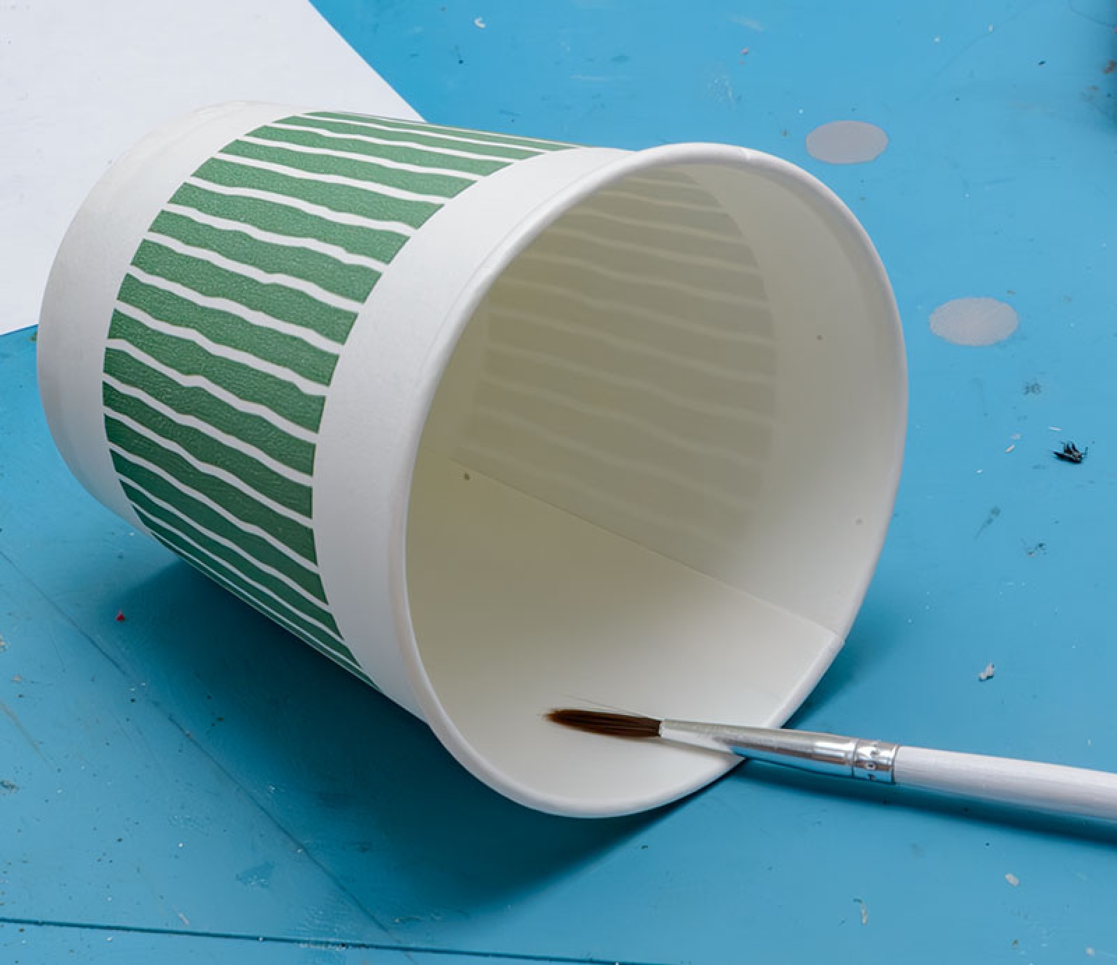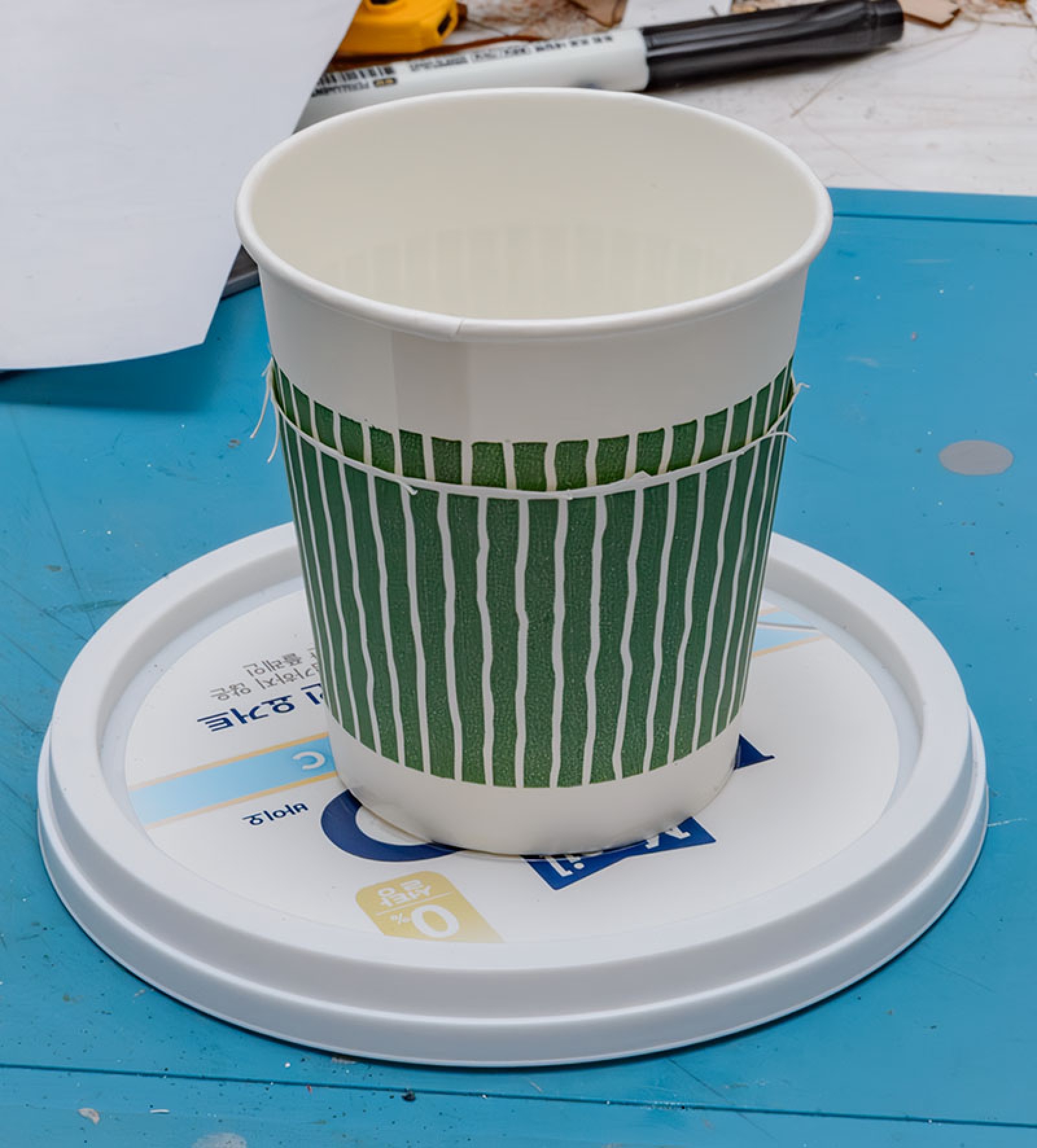 그리고 굴러다니는 재활용 뚜껑에 순접으로 붙여줍니다. 마지막으로 물을 채운 종이컵을 끼웁니다. 유레카!