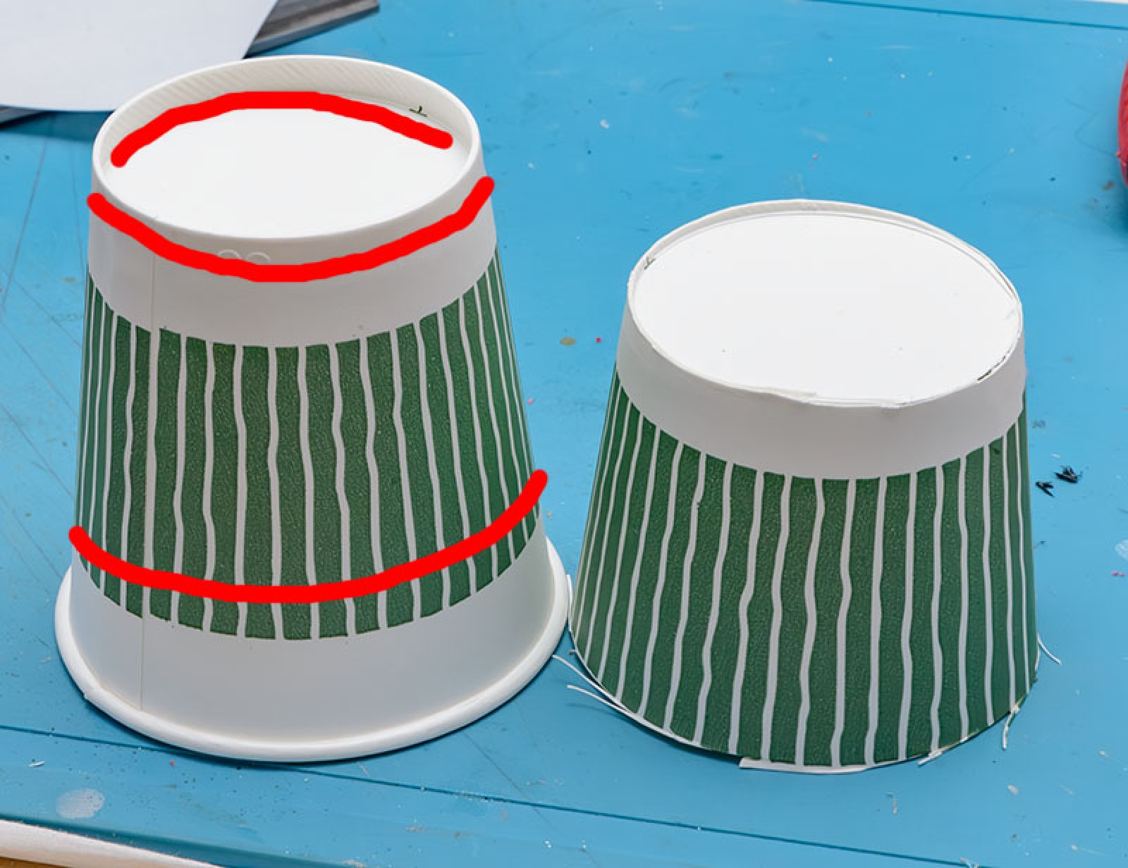 먼저 종이컵의 밑면 튀어나온 부분을 자릅니다. 윗면도 적당히 잘라서 낮춰줍니다.