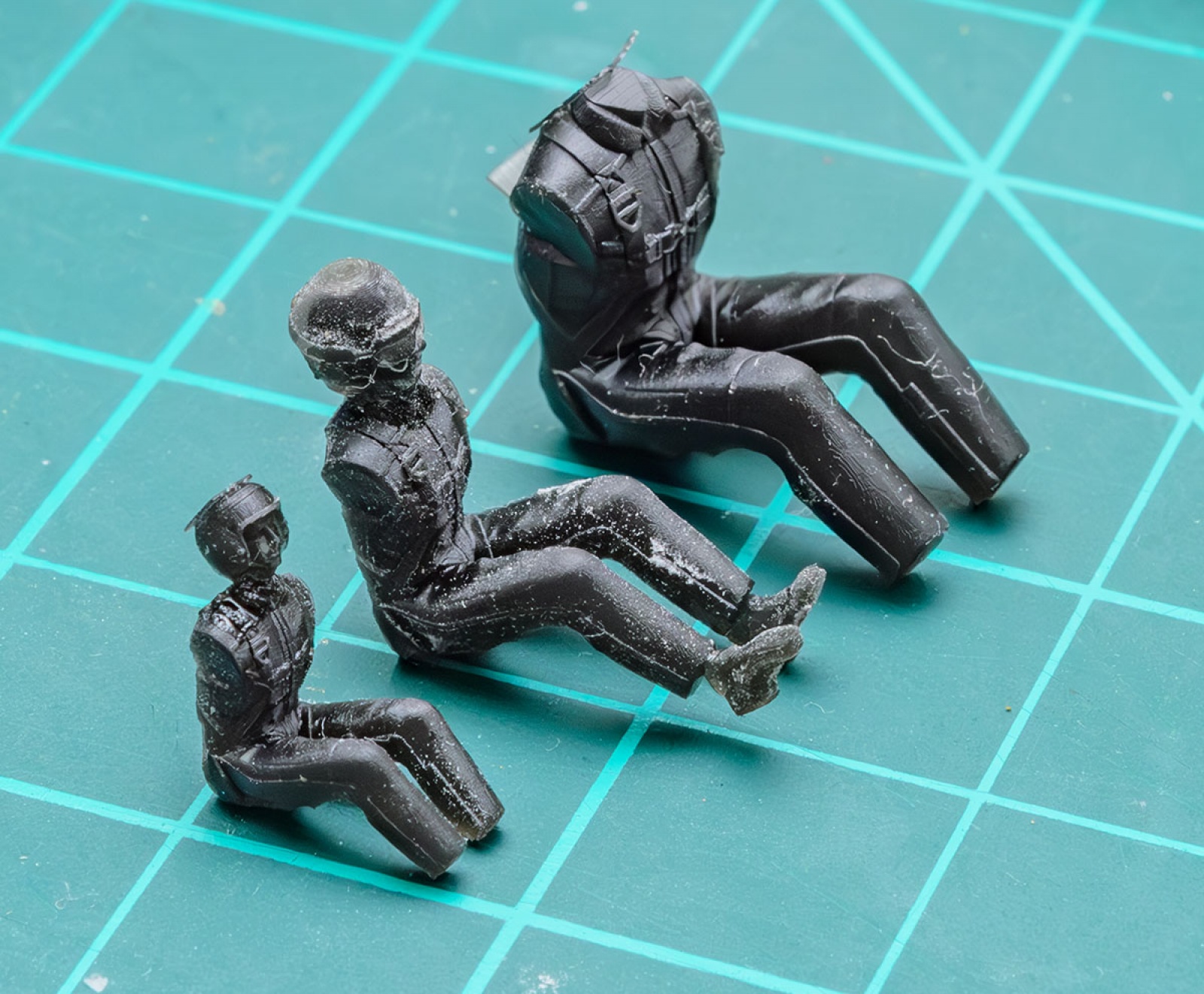 처음에 출력한 건 의자에 앉지도 못할 정도로 큰 사이즈로 1/48 에 해당합니다. 그래서 조금 작게 해서 중간 걸 뽑았는데, 이번엔 넓은 어깨가 양쪽 벽에 닿아서 팔은 끼우지도 못하더군요. 양 다리도 페달을 넘을 정도로 깁니다. 그래서 마지막으로 어깨폭까지 고려해서 더 작게 뽑았습니다.