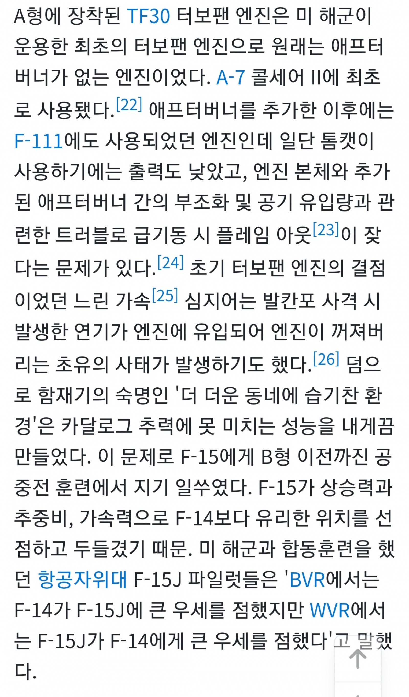 우연히 구글링하다가 일부 발췌한 자료입니다만, 제가 알기로는 예전 여러매체에서 미공군과 해군간 모의공중전에서 F-14가 F-15를 대상으로 여러차려 대승했다는 자료와 유툽에서도 유사한 자료를 보기도 했는데, 위 자료는 자위대와 미해군간 모의공중전 결과라 좀 특이하기는 합니다.