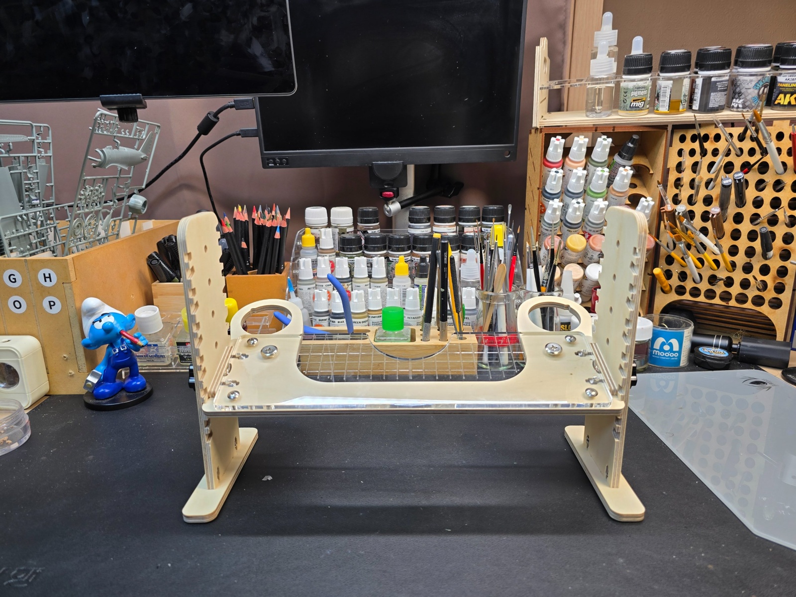 이 공간은 저에게 휴식 공간입니다. 꼭 모형을 만들지 않아도 이 책상에 앉아 영상도 보고 차도 마시고 그러며 시간을 보내면 잡스러운 일상을 잊을 수 있어서 좋습니다.