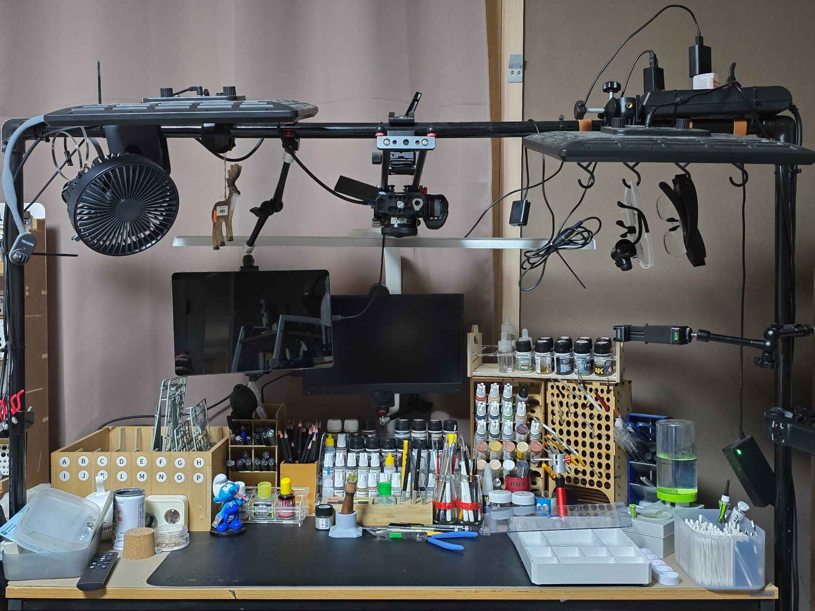 책상 크기에 맞는 철재 파이프를 맞춰서 설치했습니다. 여기에 조명, 카메라, 모니터, 리모콘 그리고 기타등등이 매달려 있기 때문에 120센티 책상이지만 공간을 확보할 수 있었습니다.