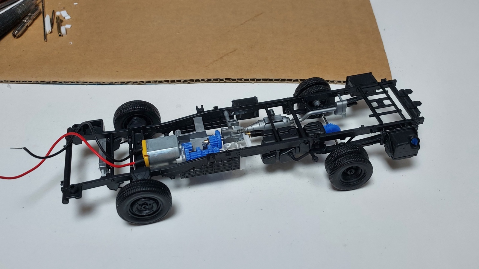 모터, 감속 기어 묶음(변속기), 동력축, 프로펠러 샤프트, 차동장치(대구)를 실차의 엔진 등 위치에 배치시키고 적당히 조합하면서 세팅을 해보았네요.