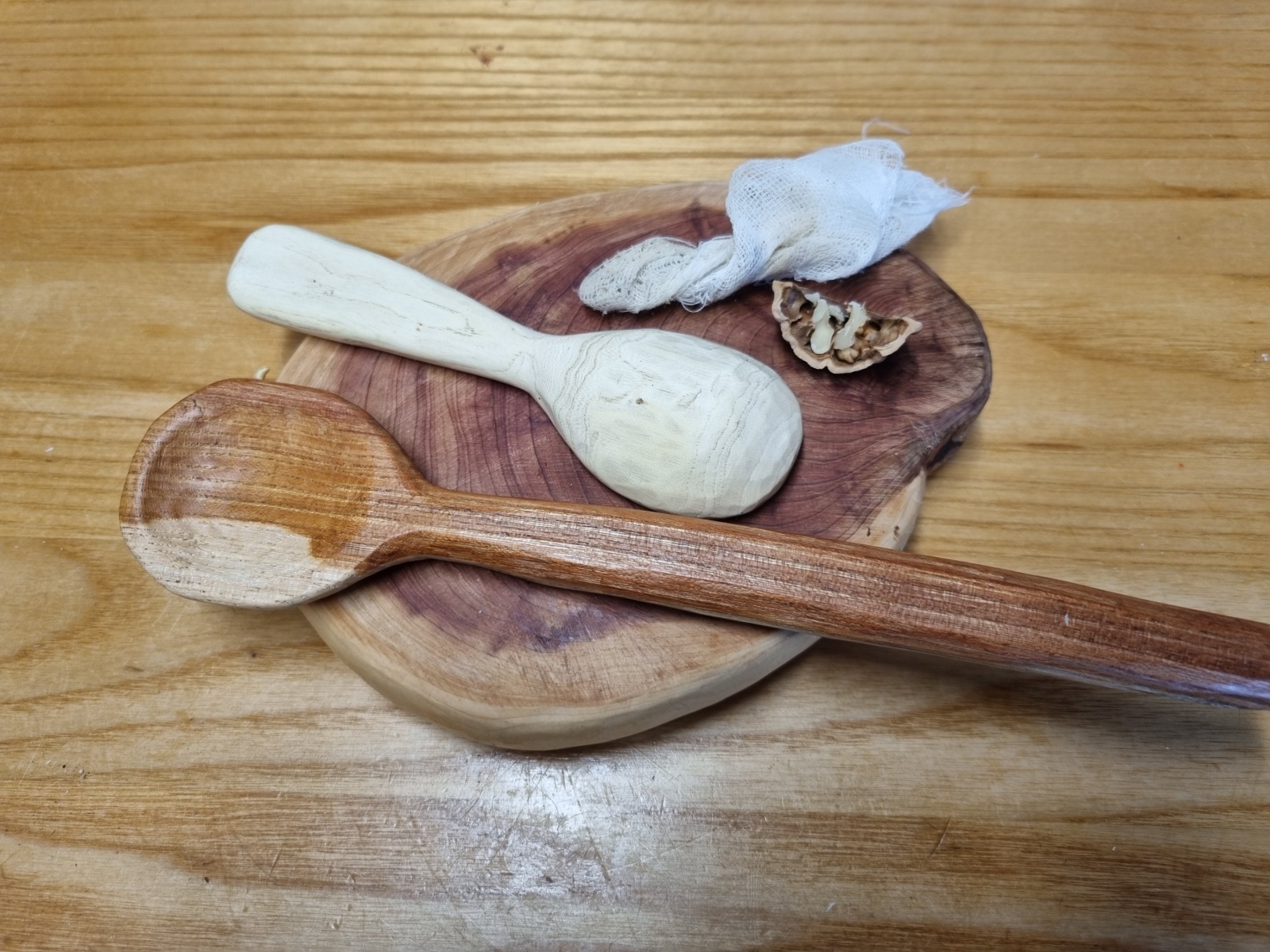 그 다음 사포질 후 오일을 입혀주는데 시판용 오일을 사용해도 되지만 소재부터 주변의 것을 사용한 김에 오일도 집에 있는 것을 사용하기로 결정. 올리브 오일과 들기름을 사용해도 되는데 둘다 향이 강해서 호두오일을 사용하기로 합니다. 물론 집에 호두 오일이 있을리 없으니 냉장고에서 뒹구는 호두를 깨서 의료용 거즈에 싸서 꼭짜며 발라줬습니다. 이때 의료용 거즈를 사용한 이유는 일반 천의 경우 얼마 안되는 호두기름을 천이 흡수해 버려서 정작 나무에 묻는 것은 얼마 안되서 구조가 어성한 의료용 거즈를 사용했습니다