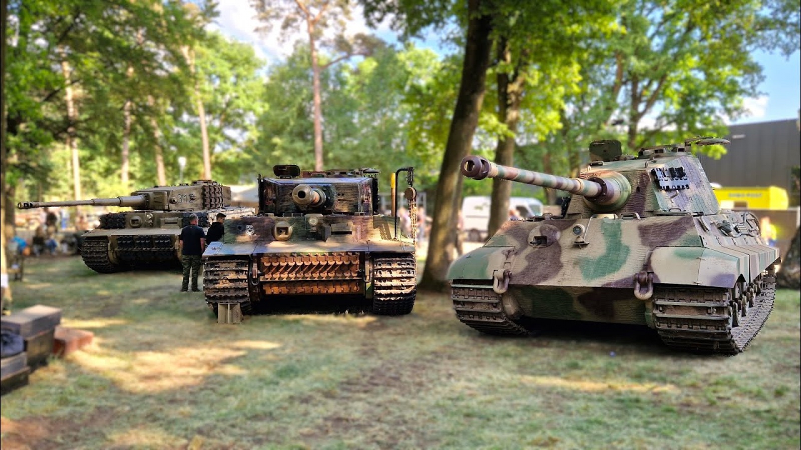 프랑스 소뮤아 박물관 소장 킹타이거(현재 남아있는 킹타들중에 유일하게 자력기동이 가능)랑 또 어디서 복원된 티거 후기형 2대가 올해 5월 행사장에 전시가 되었나 봅니다. 무려 티거 후기형이 2대나 전시가 되었는데 좌측티거는 찌메리트가 포방패만 되어있고 가운데 티거 후기형은 찌메리트가 전부 도포가 된 모습같습니다.