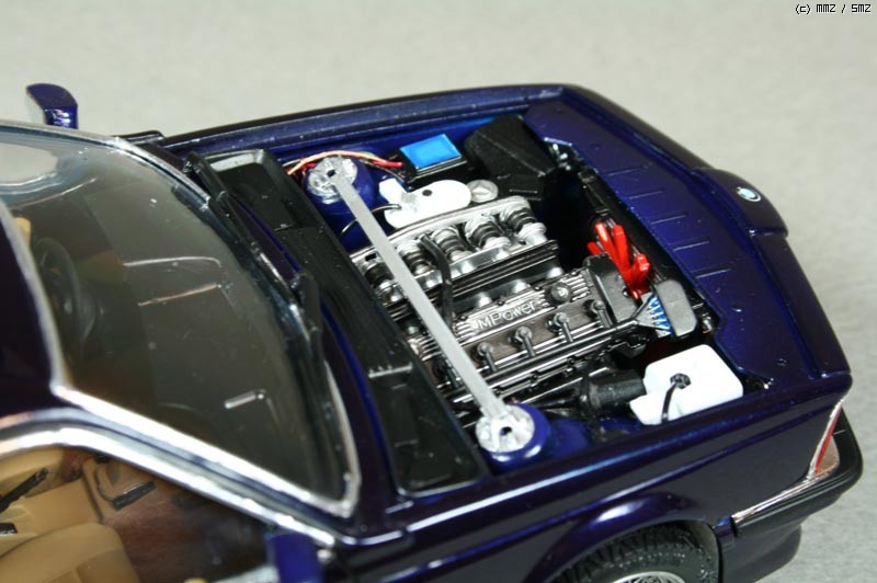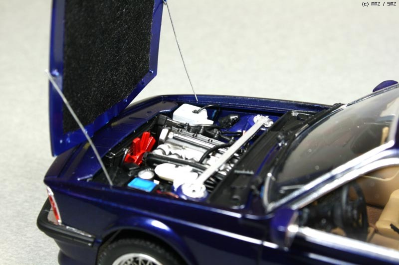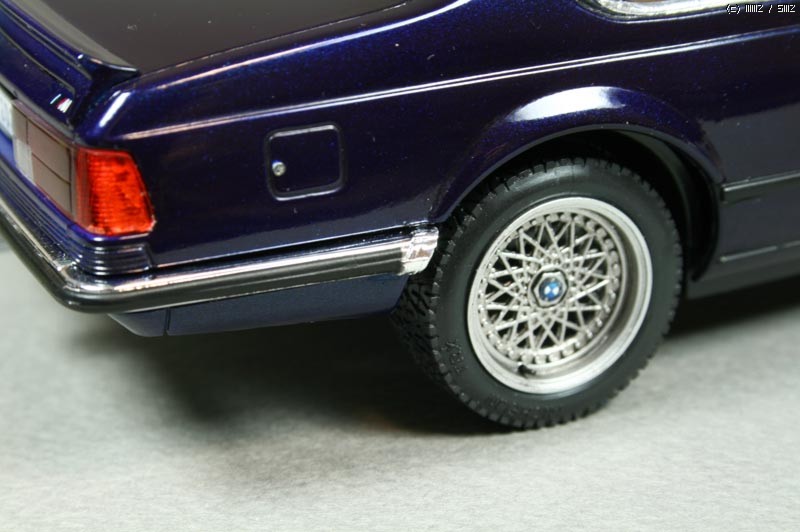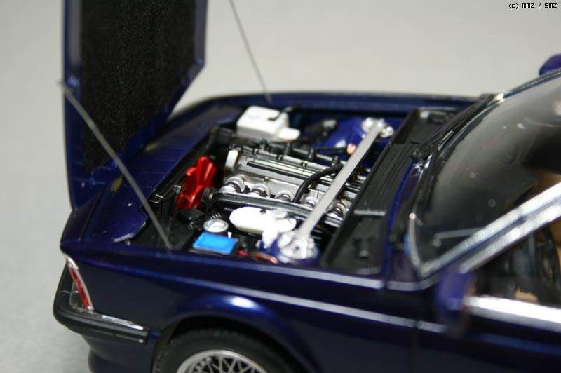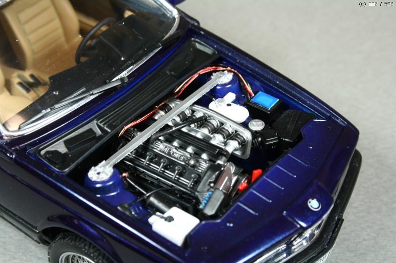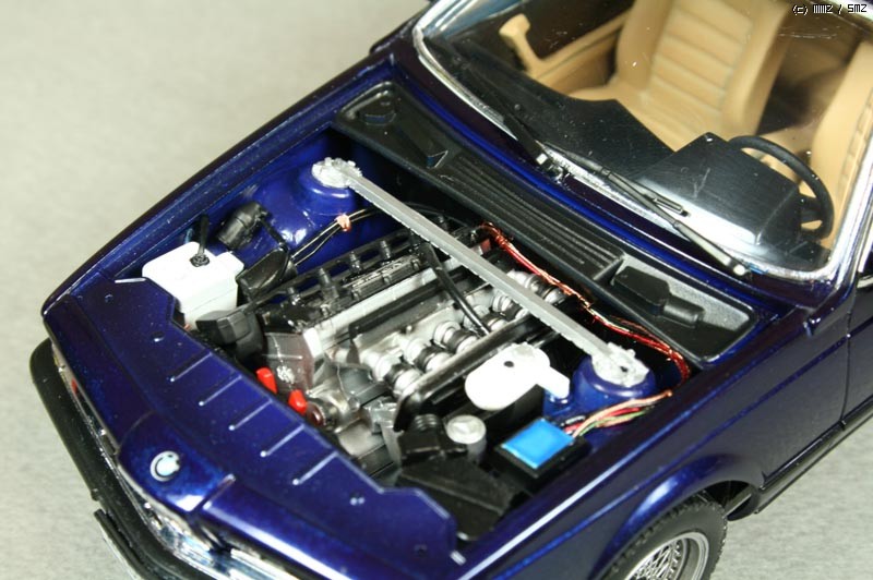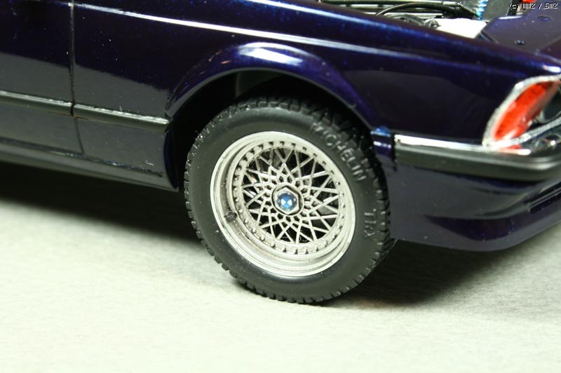 몇가지 디테일 업을 했는데 타이어 공기넣는 밸브를 런너 늘인것으로 만들어 주었고, 차체 자세를 잡아주는 스러스트 바를 프라판으로 자작해주었다. 엔진룸 배선 추가 해주었고 본넷 안쪽에 소음을 잡아주는 천(?) 같은 것을 스프래이부스 필터 종이를 잘라 검정색으로 도색하여 붙여주었다. 휠 가운데 붙은 BMW 로고는 데칼이 안들어 있어 고광택지에 인쇄하여 붙여 주었다.