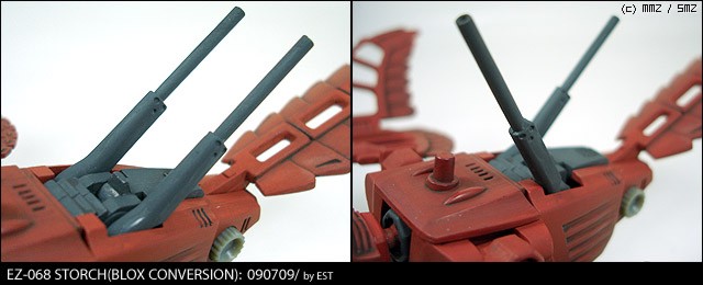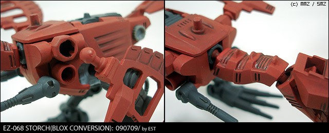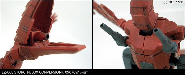 두마리를 동시에 작업한 관계로, 테스트 겸 한쪽 기체에 아이덴티티를 준답시고 시도해 본 추가무장입니다. 등 위쪽의 적을 견제할 수 있는 소구경 포를 2문 부착한 것으로, 원래 있던 축을 기준으로 움직입니다.