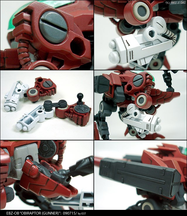 기존 제품에서는 완전 통짜인 앞다리(팔) 부분은 다른 기체의 골반 부분과 자작 파츠를 만들었는데, 마무리가 깔끔하진 않습니다만 고생한 덕분에 꽤 다양한 포즈가 나오는 데까진 어떻게 작업이 됐습니다. 뒷발은 요즘 고증의 공룡처럼 뒤꿈치를 살짝 든 것 같은 모양으로 고쳐 보았고, 무장이나 옵션파츠 등을 붙여서 약간의 디테일을 추가했습니다.