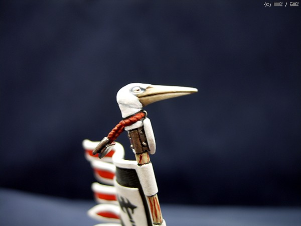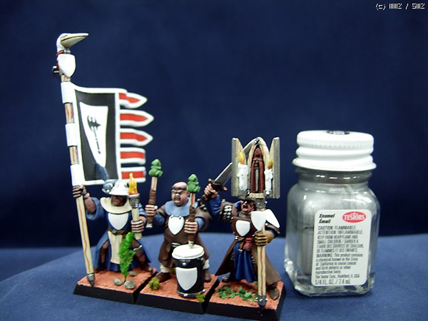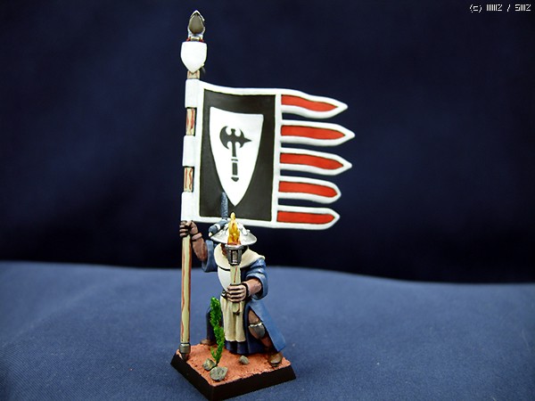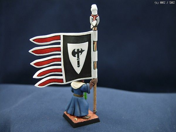 기수의 가장 큰 특징이라면 당연히 깃발인데 이 깃발이라는 물건 때문에 가장 고생하는 유닛이기도 합니다. 데칼을 사용하지 않으면 문장 또는 무늬를 예외없이 그려줘야하기 때문인데요. 모형적 완성도를 위해서라면 워해머의 데칼은 도저히 쓸만한 물건이 못됩니다. 그래서 이번에도 그려주었습니다. 그나마 이 작품의 문장은 간단한편에 속해서 그리 고생은 하지 않았습니다. 한번 그려봤던 것이기도 하고.... 흰 방패 안에 검정 도끼인데 그래서 같은 부대라면 방패를 든 보병은 예외없이 방패에 똑같은 문장이 들어가야하고 작은 방패모양의 부착물은 흰색이어야합니다. 이점이 나이트 오브 렐름(기사 유닛)과는 다른점입니다. 기사는 각각의 유닛마다 출신, 소속 가문의 문장이 그려져있습니다. 챔피언의 문장과 깃발에 그려진 문장만 같을 뿐입니다.