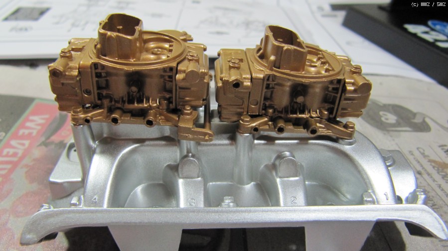 흡기다기관 위에 카브레이터를 얹었습니다. 워낙 대 배기량 핫 로드 엔진이다보니 카브레이터가 두 개 올라앉더군요.