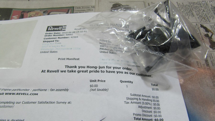 앗! 조립도중 발견하였는데, 부품이 하나 누락되어 있었습니다. 도저히 생략하고 조립할 수 없는 중요 부품, 팬 어셈블리가 빠져 있더군요. 레벨에 A/S 요청했더니 이렇게 급히 보내왔습니다.