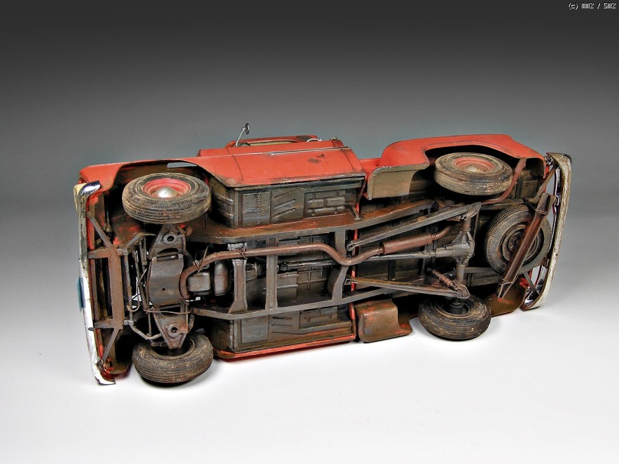 짐칸의 악세사리는 후지미 악세사리 키트에서 섭외했고(이 키트는 지난번 MaK Agent orange 디오라마에서도 사용하였는데 나름 요긴합니다^^. 별다른 추가작업 없이 거의 키트 그대로 만들었습니다. 영화에 나오는 차량 외관의 중요한 포인트인 옆면 화살표 모양의 무늬만 플라판등으로 만들어 주었고 엔진룸에 약간의 배선을 추가해주었는데 원래 키트 부품자체가 디테일이 영 엉성해서 대충 하다 말았지요-_-;; 키트는 전체적으로 품질이 조악한 편입니다, 접착제에도 잘 반응하지 않고, 쩝~ 어차피 전체적인 모양이 중요한 관계로 그냥 무난하게 완성할 수 있는 제품이었구요. 도색은 뭐 항상 하듯이 전부 바예호 아크릴로 처리했습니다.