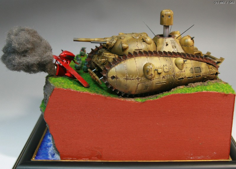 화방에서 산 모형용 잔디를 뿌리고 G-coat의 물표현재로 물을 연기표현재로 연기를 만들어봤습니다.