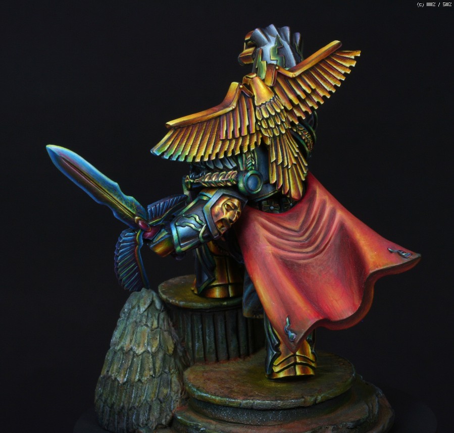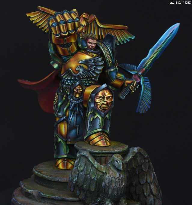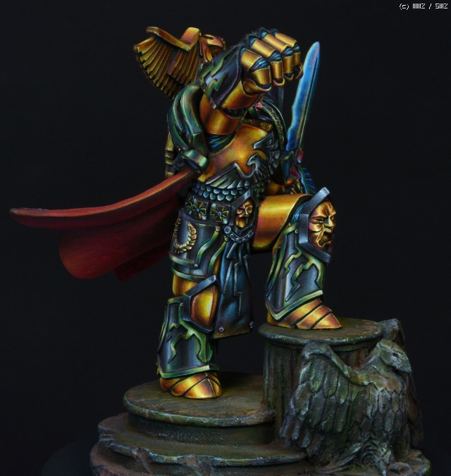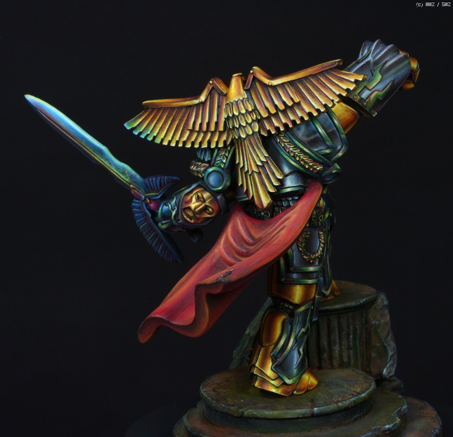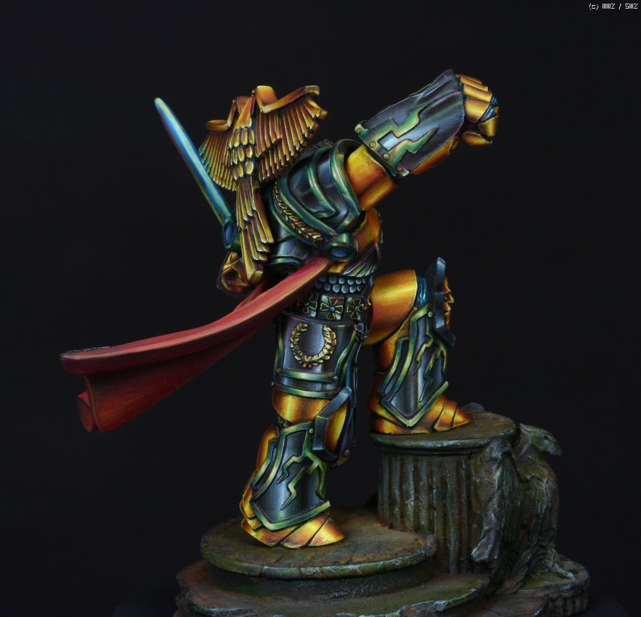 금속갑주에 적용한 페인팅 방식은 요즘 판타지 페인터들 사이에서 유행하고있는 NMM(Non Metalic Metal)이란 방식입니다. 말그대로 금속도료를 사용하지 않고 비금속도료들을 가지고 금속반사광을 그려내는 방식입니다. 처음에 메이커쪽에서 NMM으로 칠해달라고 의뢰를 했을땐 별 고민없이 OK이라고 대답했었는데 막상 작업에 들어가고나서야 이 NMM이란것이 얼마나 사람을 미치게만드는 것인지 절실하게 느꼈습니다. 작업시간만 1/35인형 세개는 칠할 수 있는 시간이 소요되었으니..뭐, 말다한거죠..