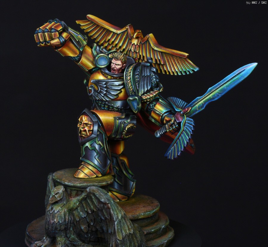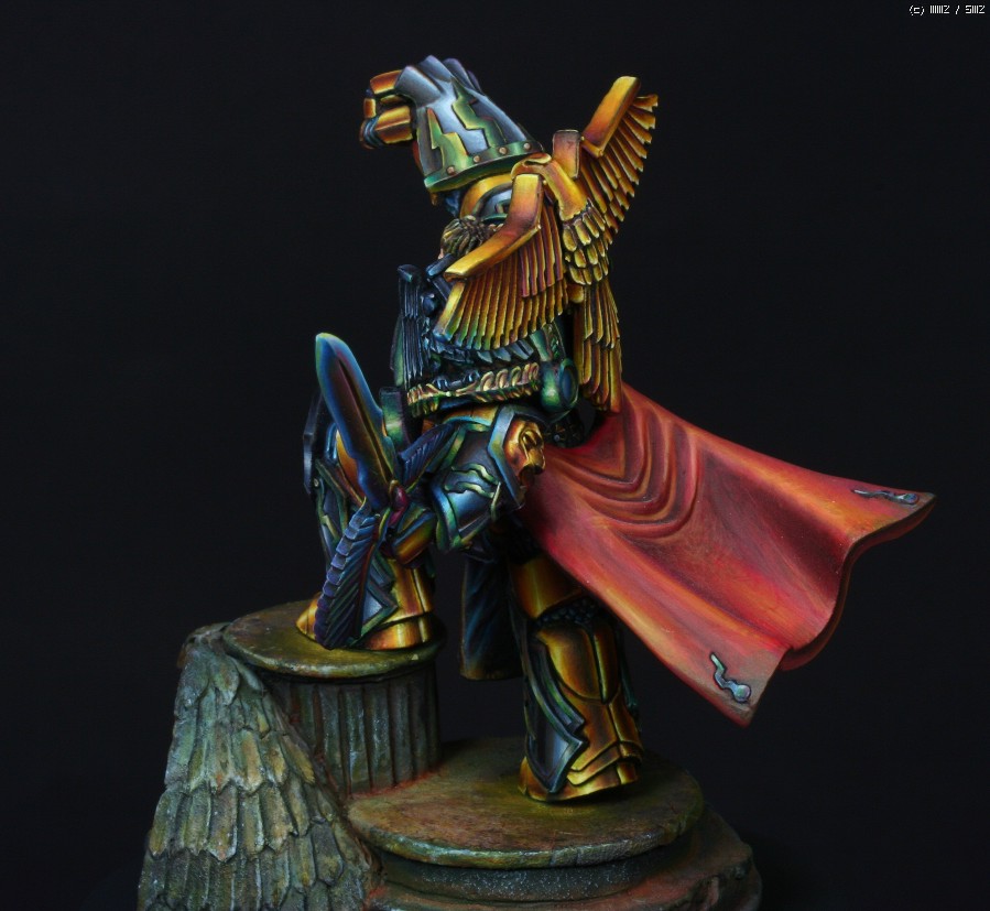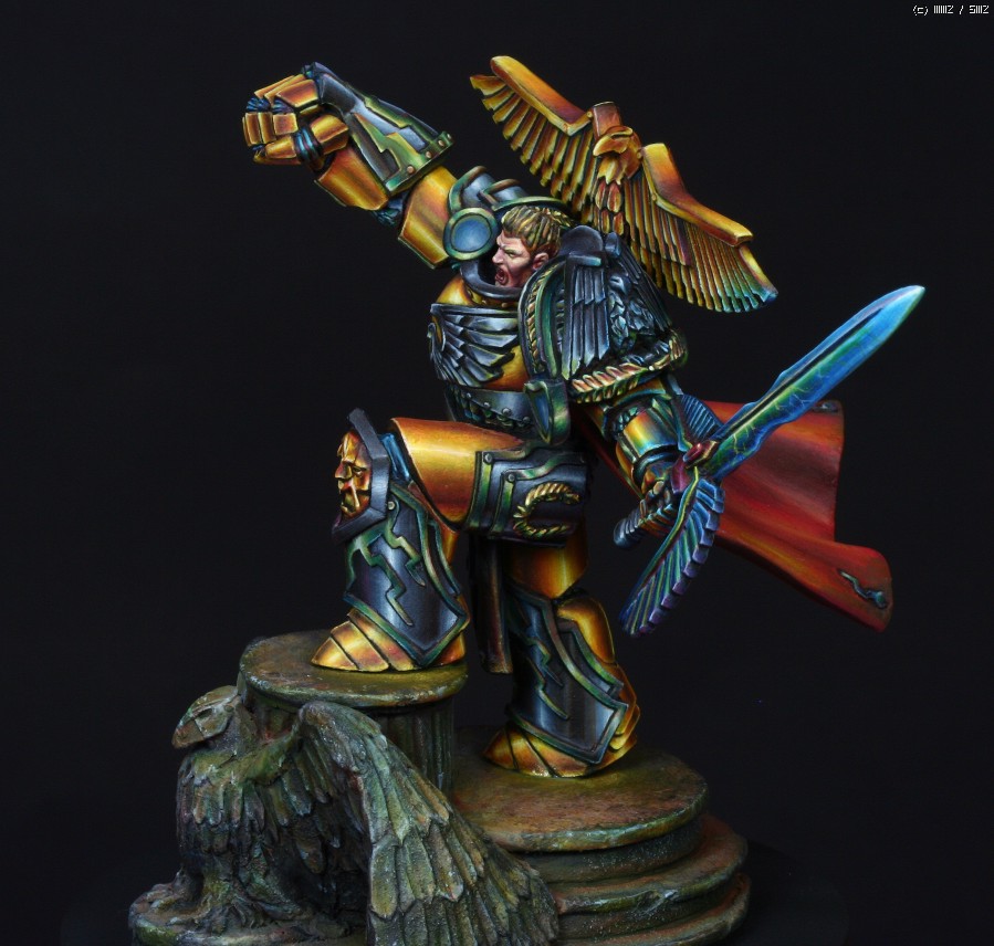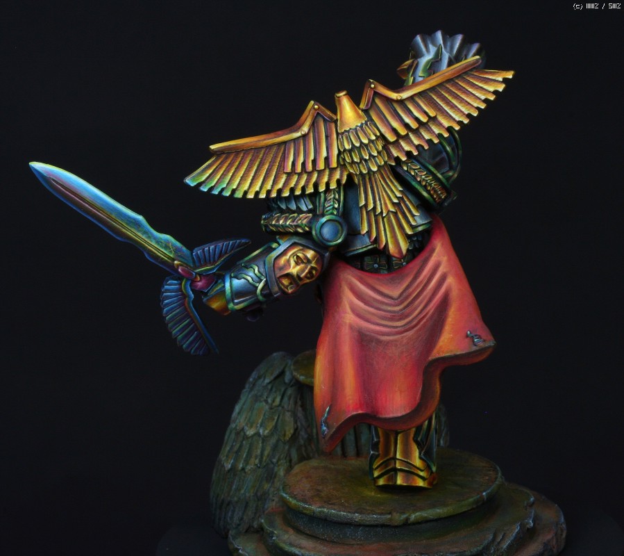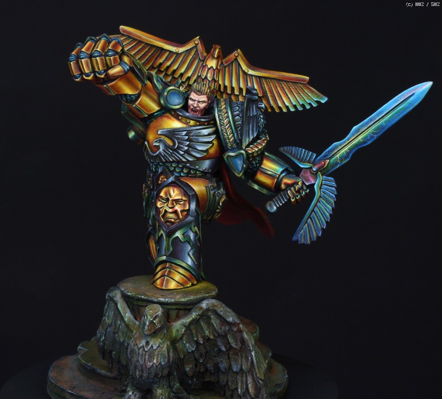 금속갑주에 적용한 페인팅 방식은 요즘 판타지 페인터들 사이에서 유행하고있는 NMM(Non Metalic Metal)이란 방식입니다. 말그대로 금속도료를 사용하지 않고 비금속도료들을 가지고 금속반사광을 그려내는 방식입니다. 처음에 메이커쪽에서 NMM으로 칠해달라고 의뢰를 했을땐 별 고민없이 OK이라고 대답했었는데 막상 작업에 들어가고나서야 이 NMM이란것이 얼마나 사람을 미치게만드는 것인지 절실하게 느꼈습니다. 작업시간만 1/35인형 세개는 칠할 수 있는 시간이 소요되었으니..뭐, 말다한거죠..