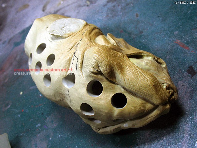중심을 꼬리에 두어야 하는 만큼 앞쪽의 무게를 최대한 줄이는 것이 이번 작업의 성공여부가 달렸습니다. 그래서 괴물 허리부터 머리부분까지 여러개의 타공을 하였습니다. 내부에도 대부분의 레진 덩어리를 걷어 내어야 했습니다.