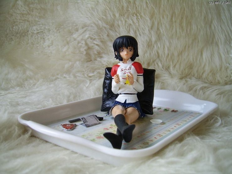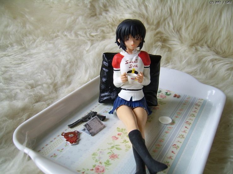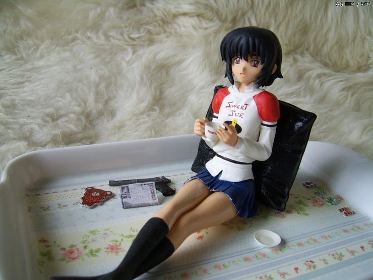 '느와르'라는 애니의 등장인물이라고 합니다. 제가 만든 것중에는 드물게(?) 옷을 갖춰입은 완성작입니다. ㅋ 옷의 그림은 레벨 1/48 F-86D에 들어있는 노즈아트 데칼이며 베이스는 쟁반입니다.