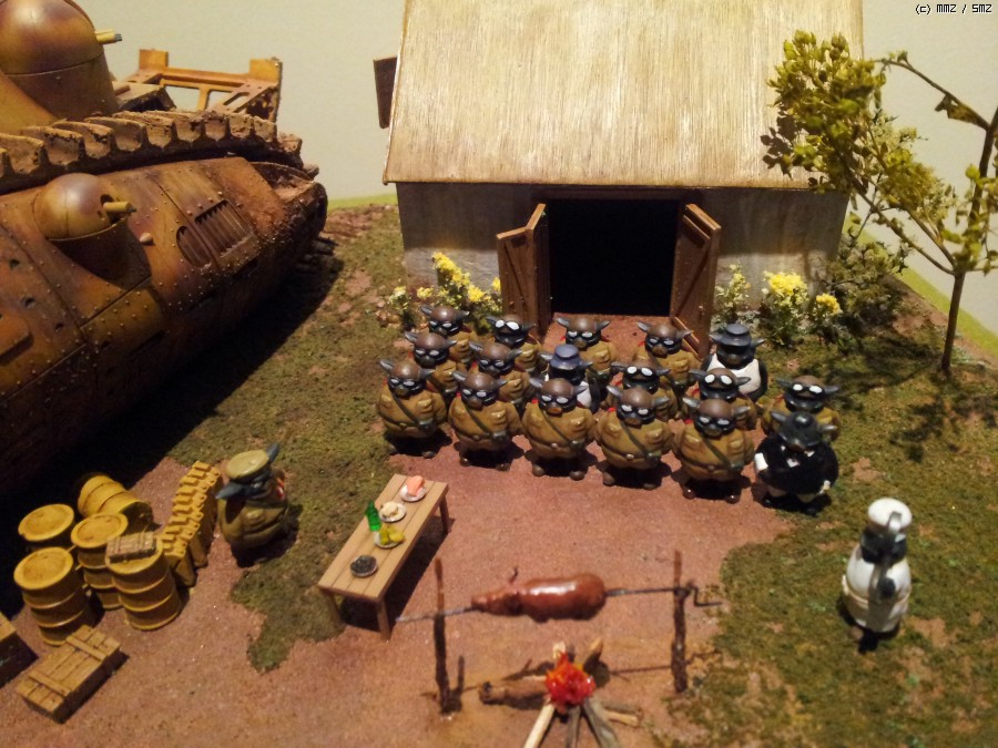 오랫만에 인사드립니다. 그동안 에어브러시 작업만 하면 목이 아파 미루다 2주전에 작업 하기 시작해 완성 했습니다. 타스카의 72스케일 악역1호고 안에 있는 피겨들을 이용했습니다. 돼지들이 돼지 바베큐를 먹는다는 설정이 재미 있을듯 하여, 카페 형님께 부탁해 예쁜 돼지 바베큐를 얻었습니다. 오랫만에 완성한 거라... 감이 많이 떨어지네요. 다음 작품은 훨 신경써서 만들어야 하겠습니다. 즐거운 모형생활 하십시요.