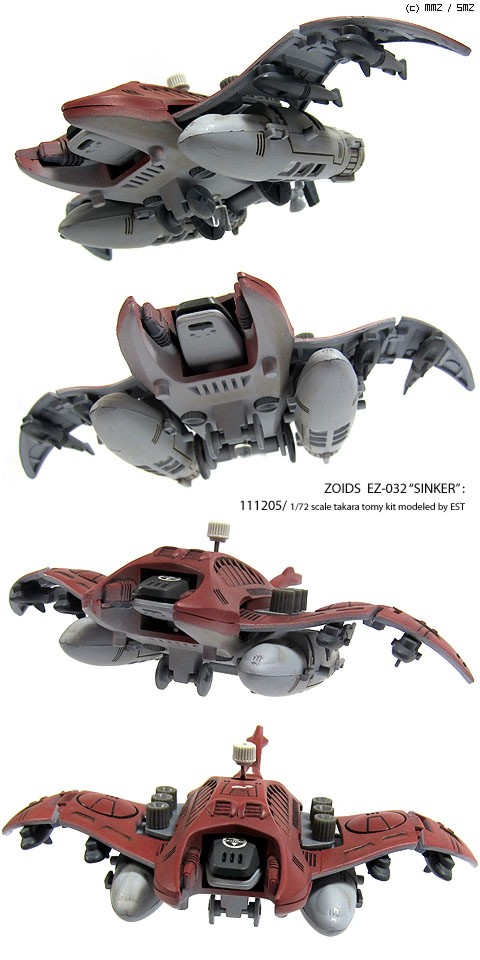 원래 조이드를 만들 때는 태엽이나 모터 가동부를 들어내거나 아니면 감추는 식의 방법을 취해왔습니다만 이 싱커의 경우는 플레이 밸류를 포기하고 싶지 않았던 터라 접합선 같은 것도 신경스지 않고 그냥 약간 다듬는 정도에서 데칼링과 채색만 했습니다.