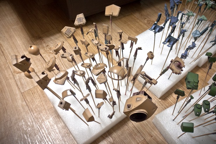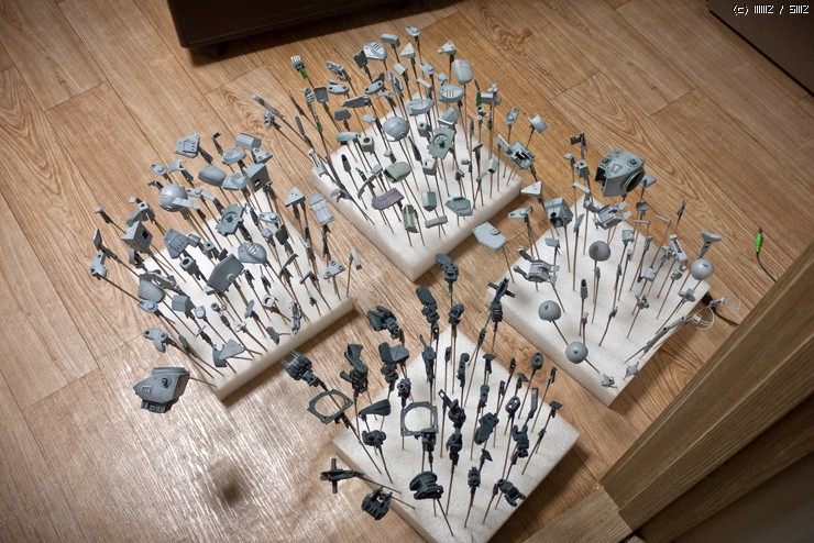 두 킷의 부품들에 서페이서 올리고 찍은 사진입니다.