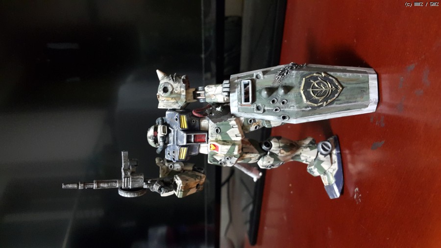 짐 카이를 기본으로 자쿠용 어깨 쉴드와 자쿠F2헤드로 바꿔주고 히트호크와 자쿠1용 구형 자쿠머신건을 사용했습니다 연방의 표준방패역시 지온 마킹과 근접전용 스파이크를 추가했고 보이지는 않지만 등쪽에 별매품을 이용 버니어와 증가연료탱크도 추가했습니다