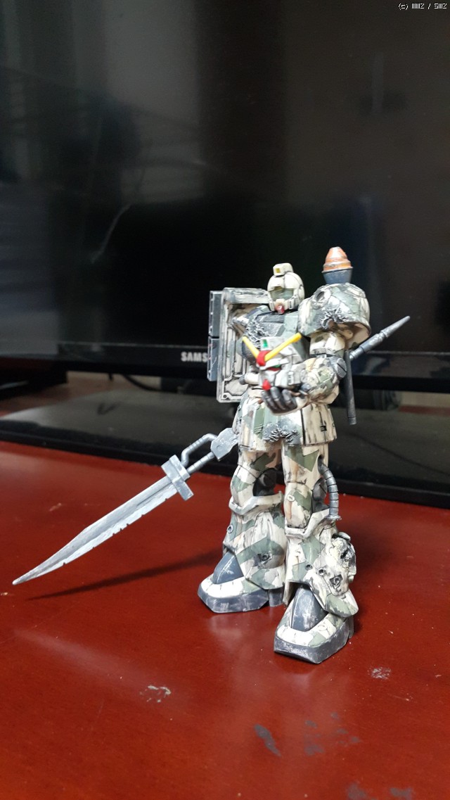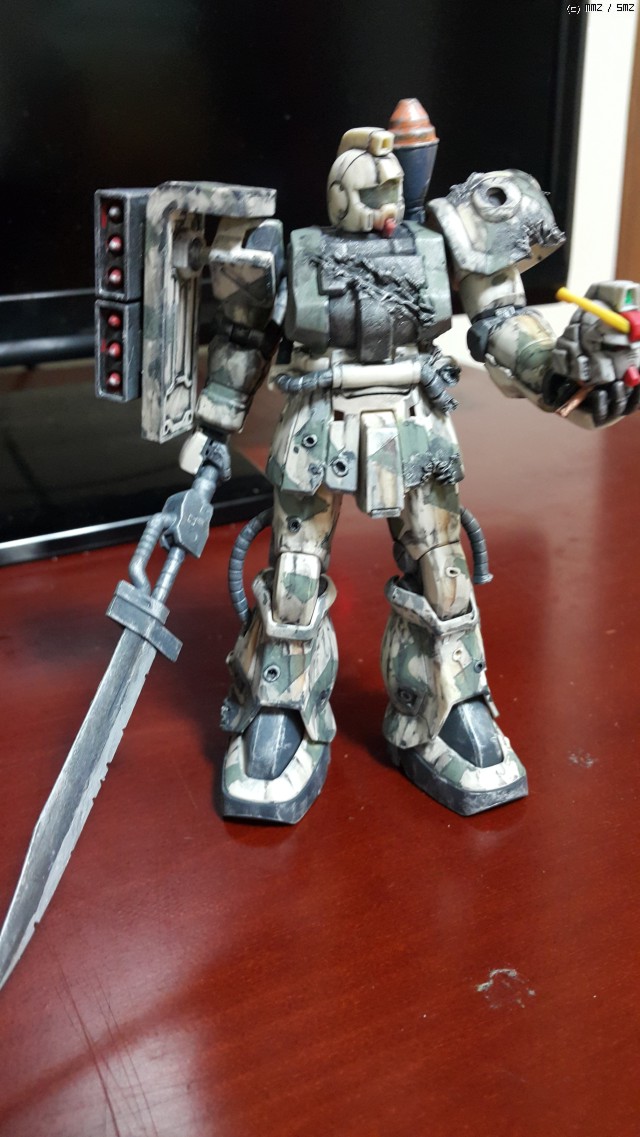 1/144 자큐F2을 기본으로 손상된 머리는 연방군 짐을 노획해서 현지개수했다는 가정하에 짐 머리를 부착하였습니다(지상전 세트 별매품 이용), 디오리진의 자쿠를 보고 'ㄱ'쉴드에 미사일 포드를 부착하면 좋겠구나하고 생각이 들어 다리에 부착하게 되어있는 미사일 포드를 쉴드로 옮기고, 무장은 별매품을 이용하였습니다., 육전형 건담을 격파하고, 노획물로 건담 머리를 들고 있는 상황입니다..