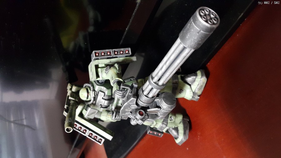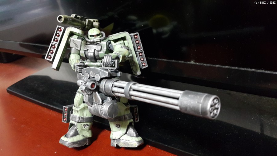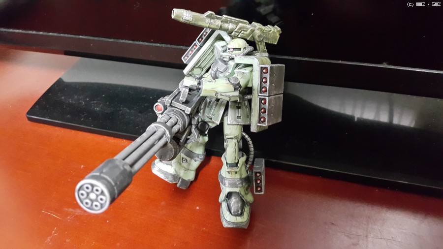 자쿠F2가 화력지원 기체로 개조된다면 어떻게 될까 생각하보고 만들어봤습니다... 미사일부터 메가입자포 캐틀링까지... 특히 캐틀링기괸포가 생각보다 길어 무게중심이 쏠리다보니 기울어져 기대어서 사진을 찍었습니다.. 미사일 포드는 그동안 만들면서 남는 부품으로 채웠습니다 어깨 메가입자포는 타이야 에나멜 국방색으로 칠한건데 도료탓인지 신너비율이 틀린탓인지 점착성이 떨어져 이앙하게 되었습니다
