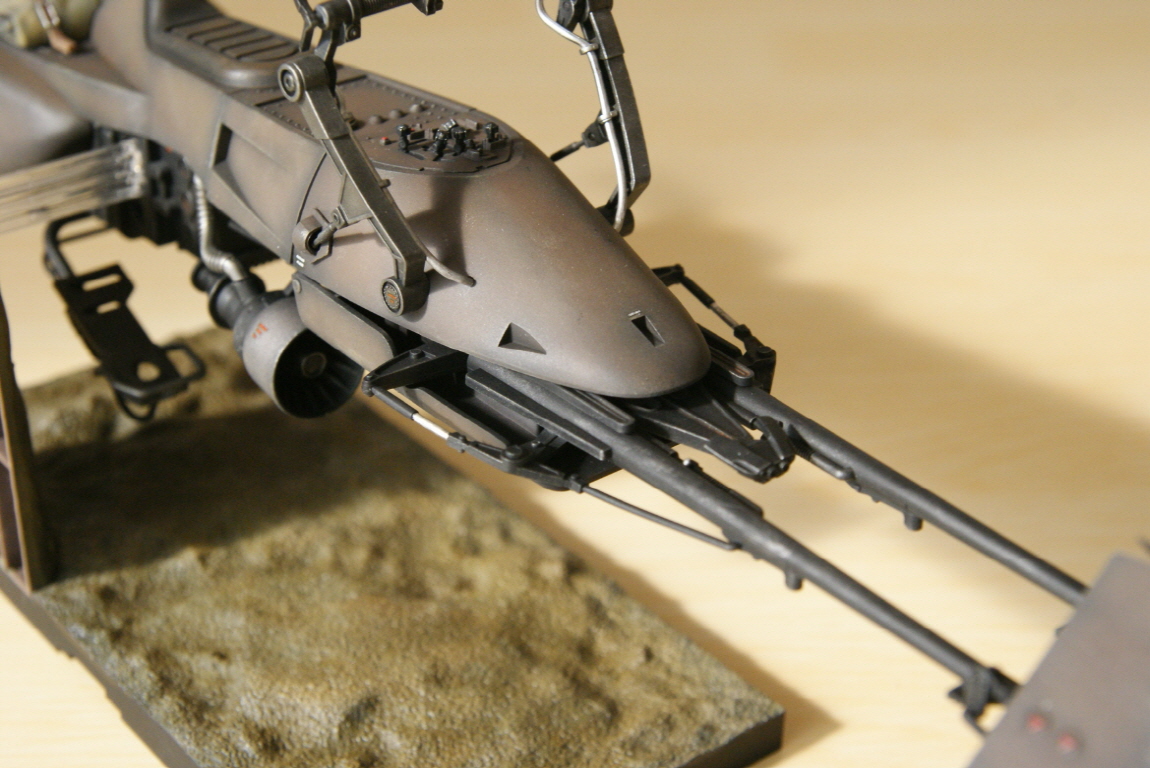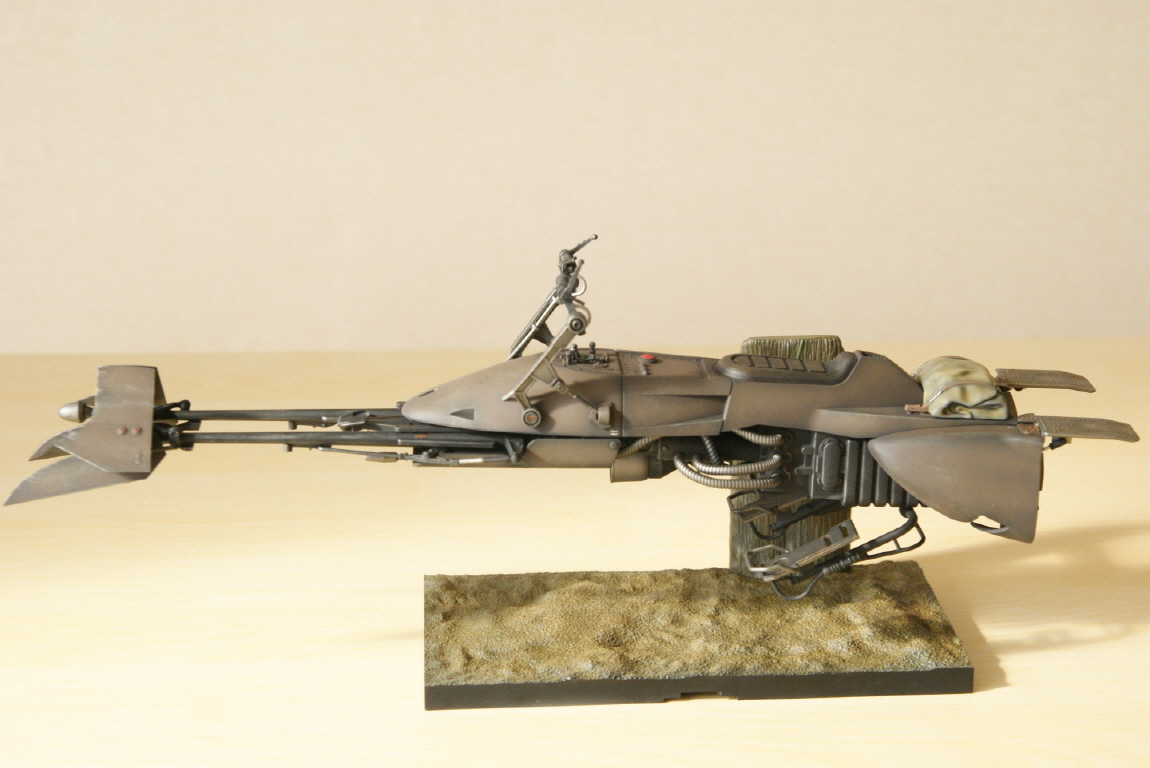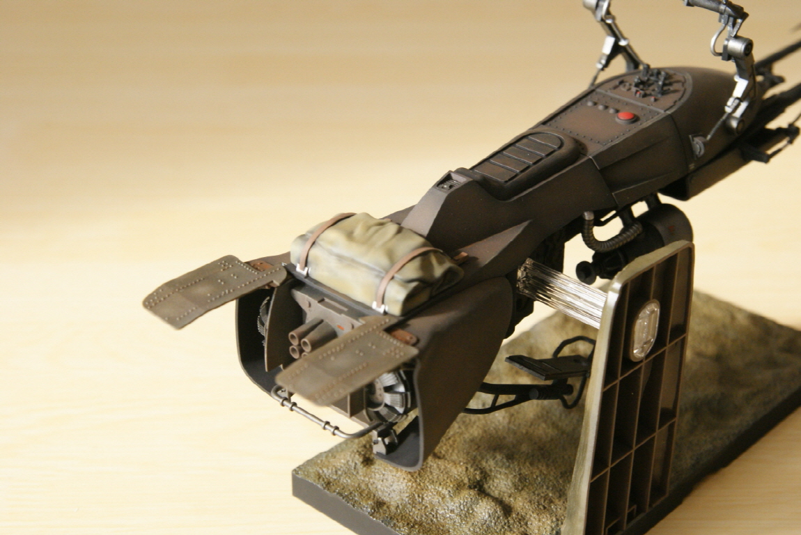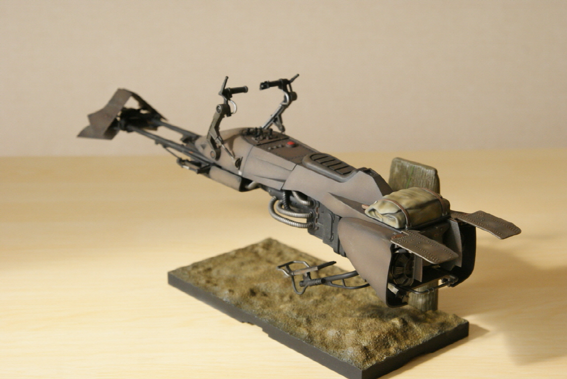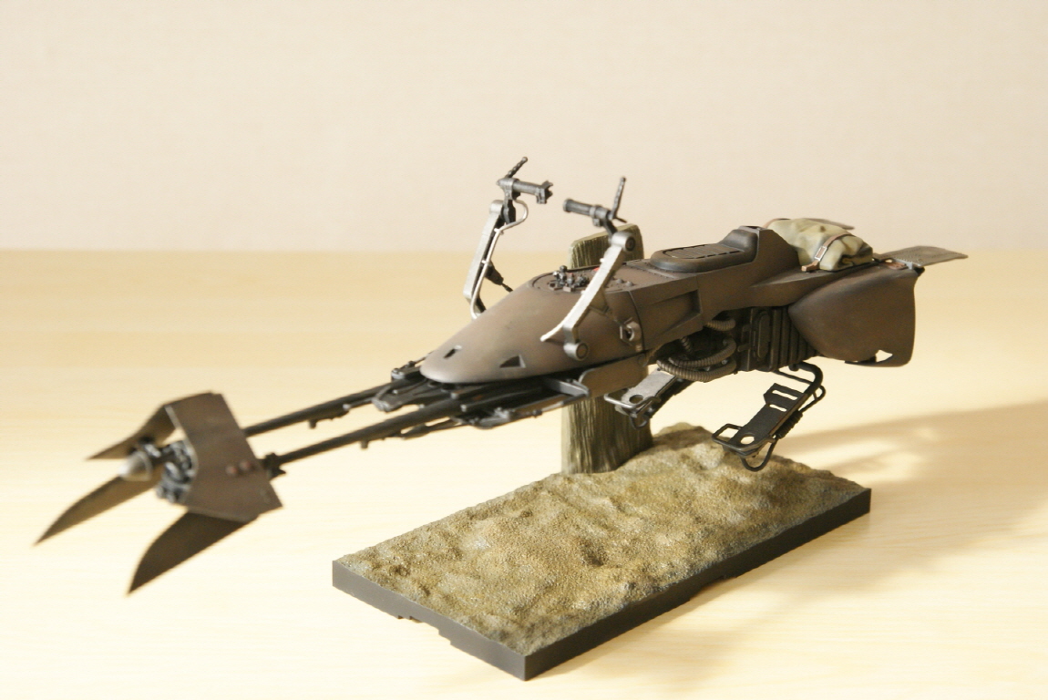 반다이 프라스틱은 에나멜 신너 접촉시 부스러지는 웨더링(특히 워싱)만 조심하면 큰 스트레스 없이 만들수 있습니다. 건프라 보다는 접합선 등의 신경쓰이는 부분이 있으나 영화느낌 생각하며 만들면 나와준것이 감사하다는 생각입니다. 스크롤 내리면 스피더 바이크도 있으니 즐겁게 봐 주세요^^.
