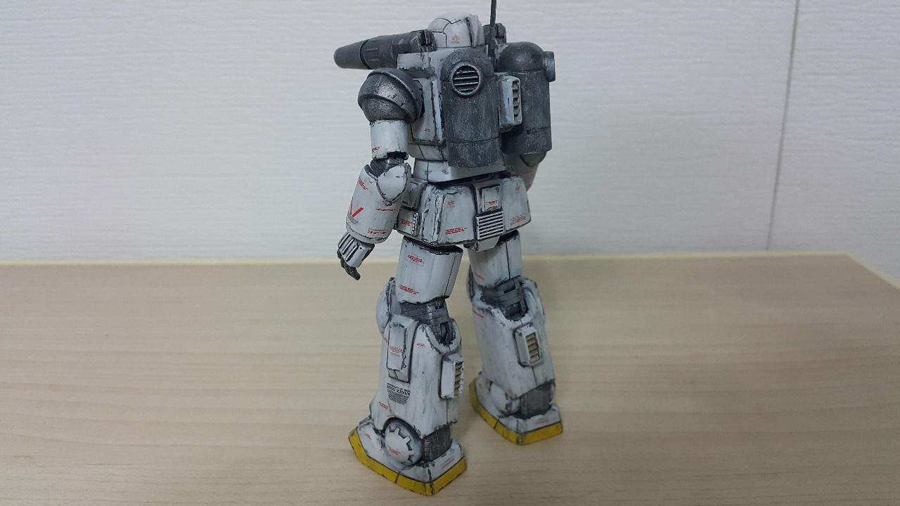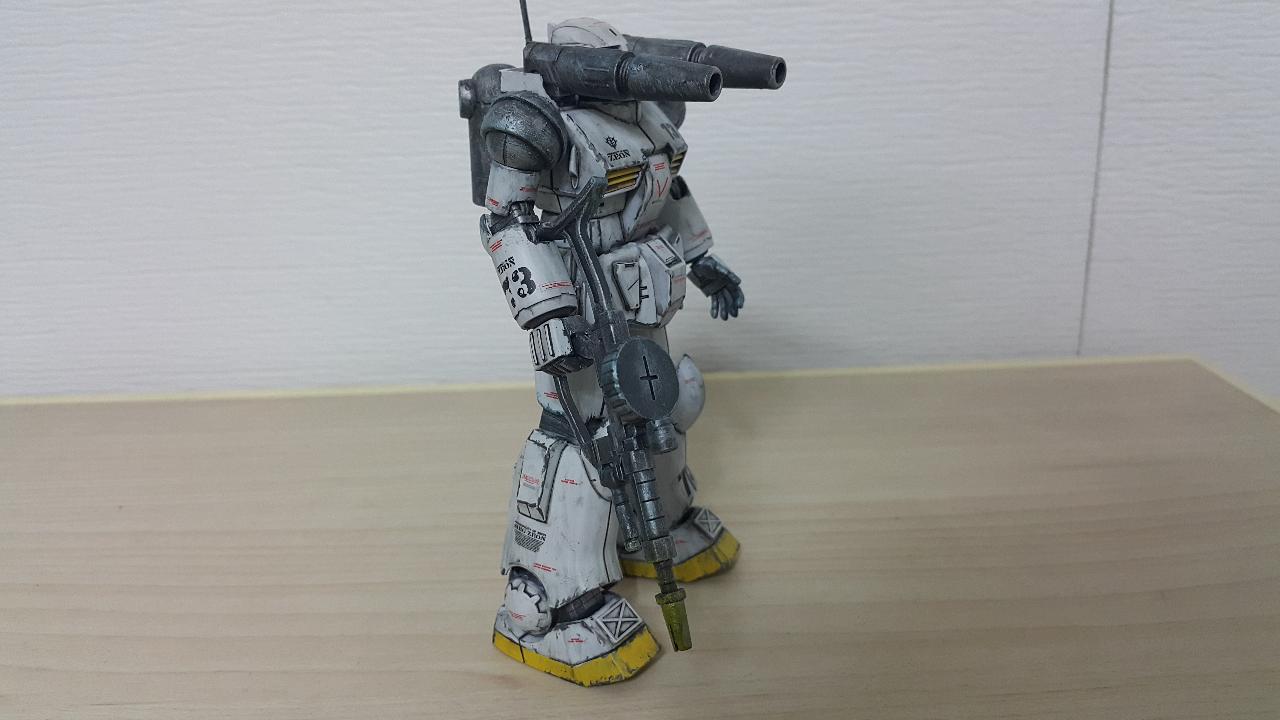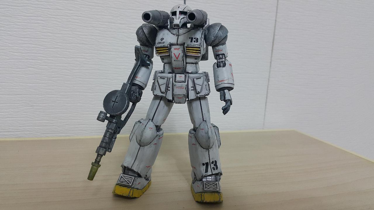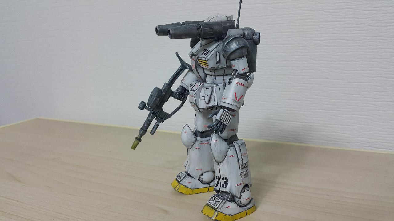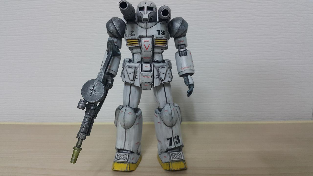 그냥 색깔만 바꿔치기로 하면 싱거워서 지온군이 노획해 개조했을 상황을 생각해 자쿠1 머리와 자쿠머신건을 들게 했습니다. 단조로워 보이는 부분에 증가장갑과 스러스터, 안테나도 달았습니다.