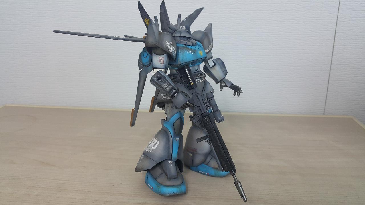 워낙 투박하게 생긴 기체라 하반신에 패널라인을 추가로 파줬습니다. 날개는 SEED Destiny 임펄스 건담 것을 사용했습니다. M16비슷하게 생긴 빔라이플은 시스템웨폰즈 시리즈를 쓰고 남은 것인데, 인터넷을 통해 확인해보니 마침 겔구그용 신형 빔라이플이었습니다.