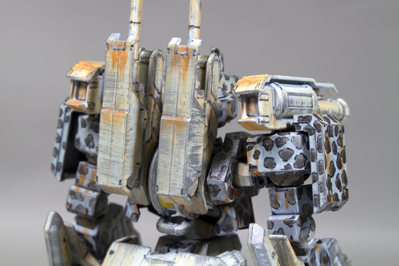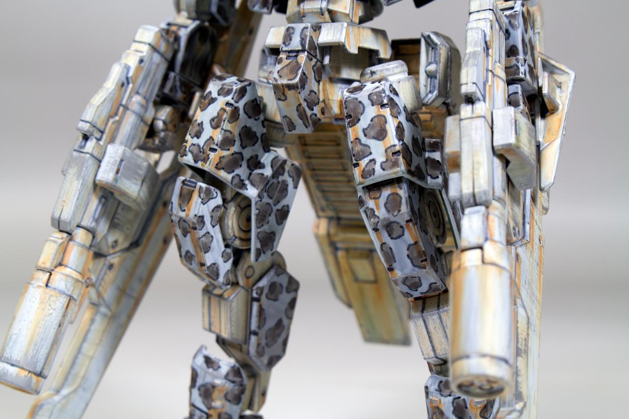 화이트로 전체를 칠하고 건조한 다음 회색으로 위장 무늬를 넣고 먹선 펜으로 패널 라인과 무늬를 강조해 주었습니다.