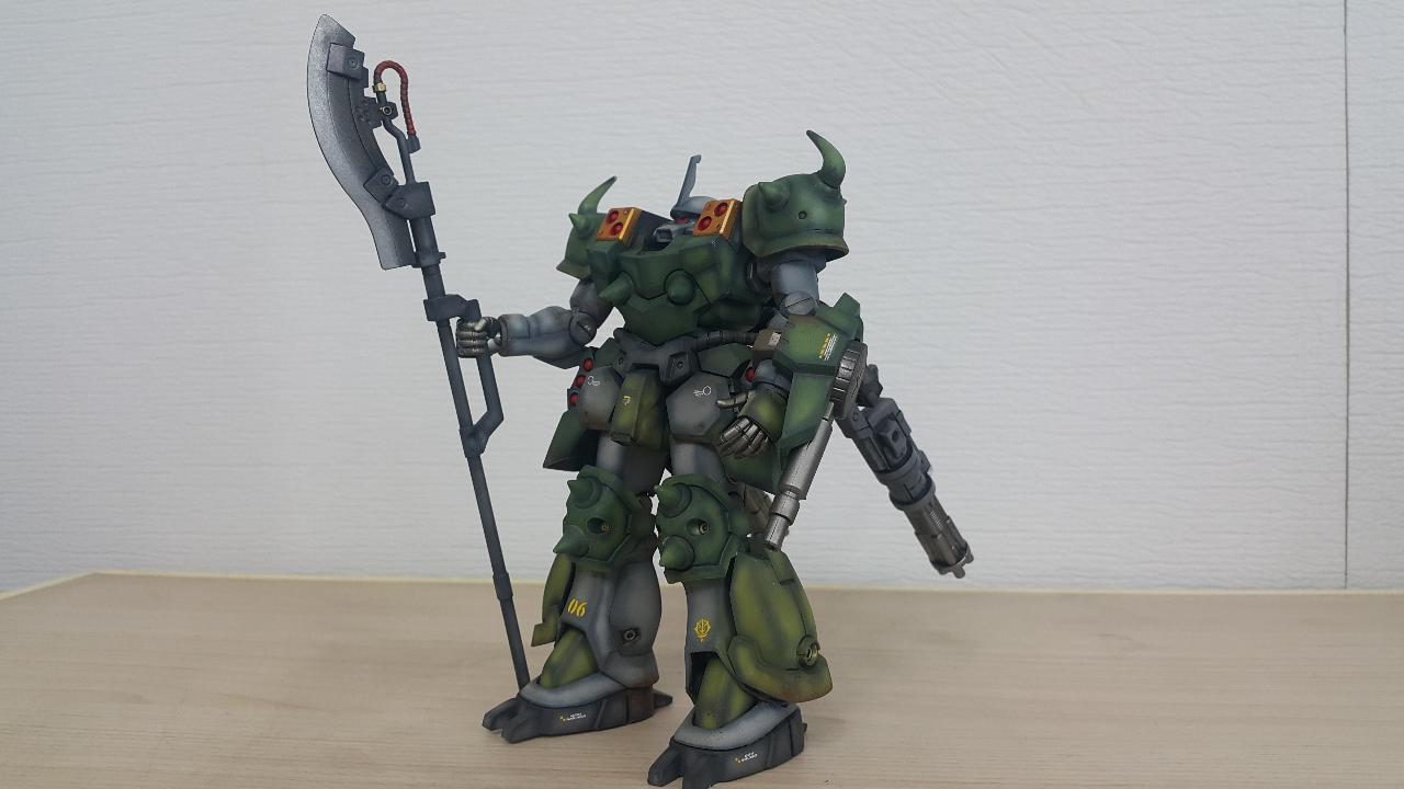 색상은 원래 보라계통이었는데, 자쿠답게 녹색계열로 도색했습니다. 대형 빔호크는 히트호크처럼 금속재질 처럼 보이게 칠했습니다.