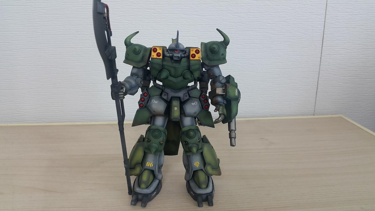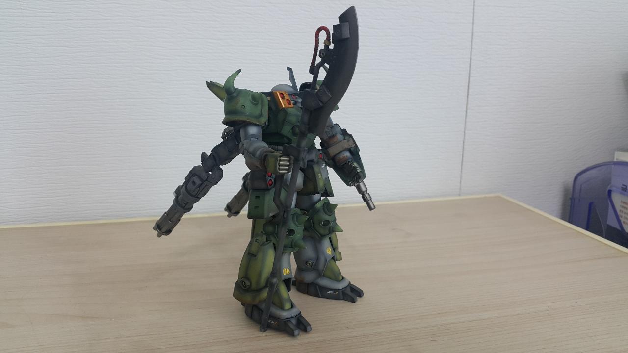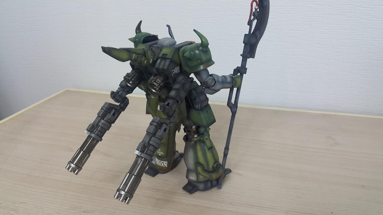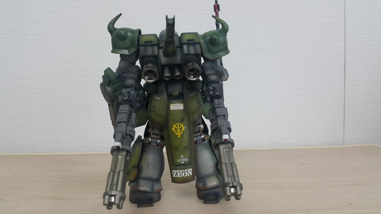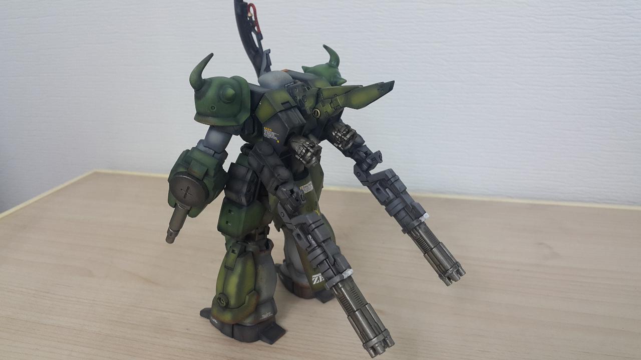 개조부분은 구프같은 느낌을 주기위해 머리와 어깨장갑을 구프커스텀 것으로 교체하였고, 백팩에 고기동 수직날개추가, 메인버니어 교체, 서브암 무장을 기존 자쿠F2에서 4연장 발칸으로 교체하였습니다.