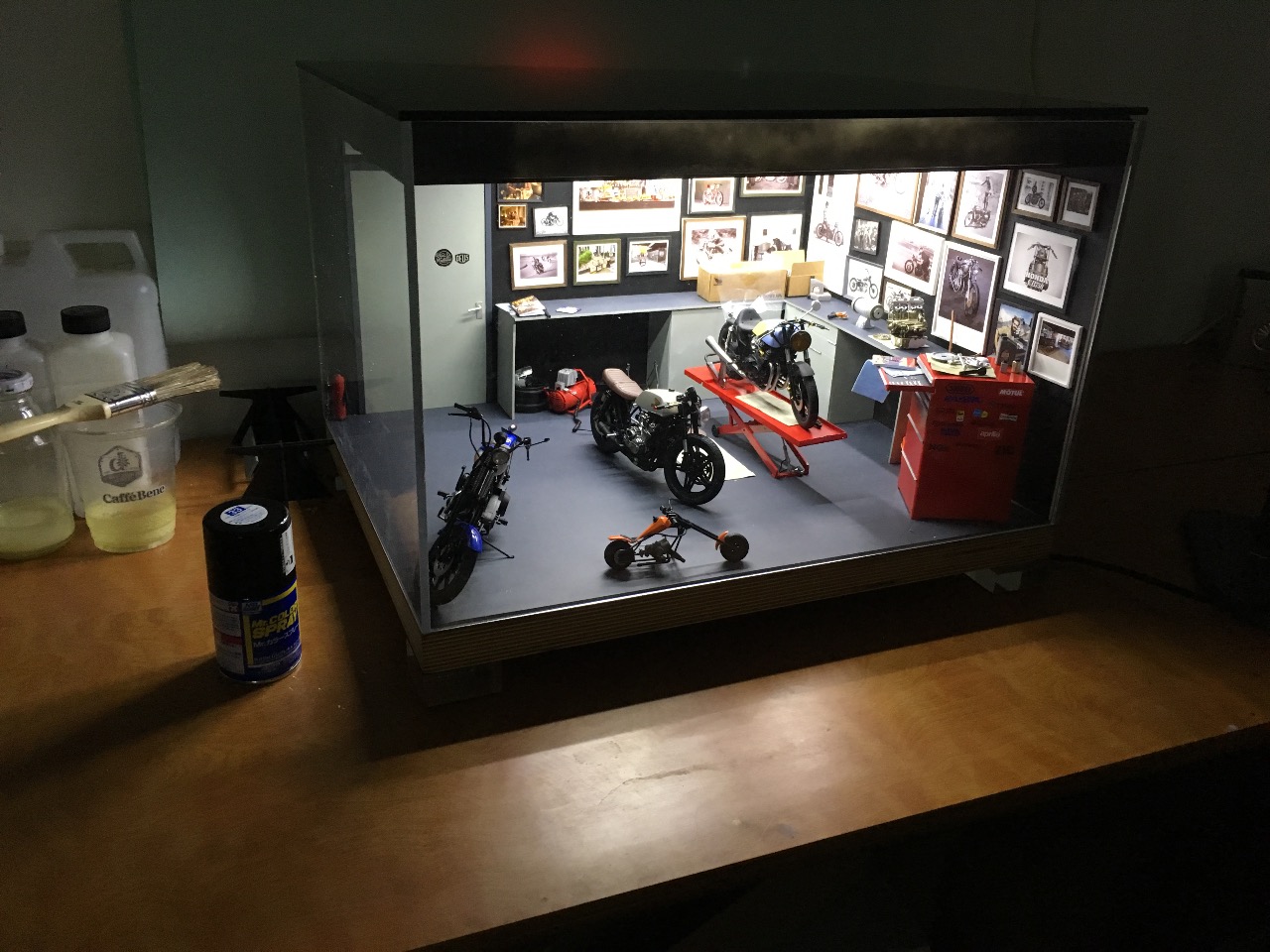 테이블 위에는 약간의 자잘한 소품들이 보입니다. 왼쪽부터 혼다의 레이싱 머플러 박스(실제 안쪽에 스티로폼으로 팩킹된 레이싱 머플러도 넣어놨습니다.), 부품상자, 핸드드라인더(안쓰는 부품을 이용해서 자작), 탁상용 그라인더 연마기(역시 자작) 입니다.