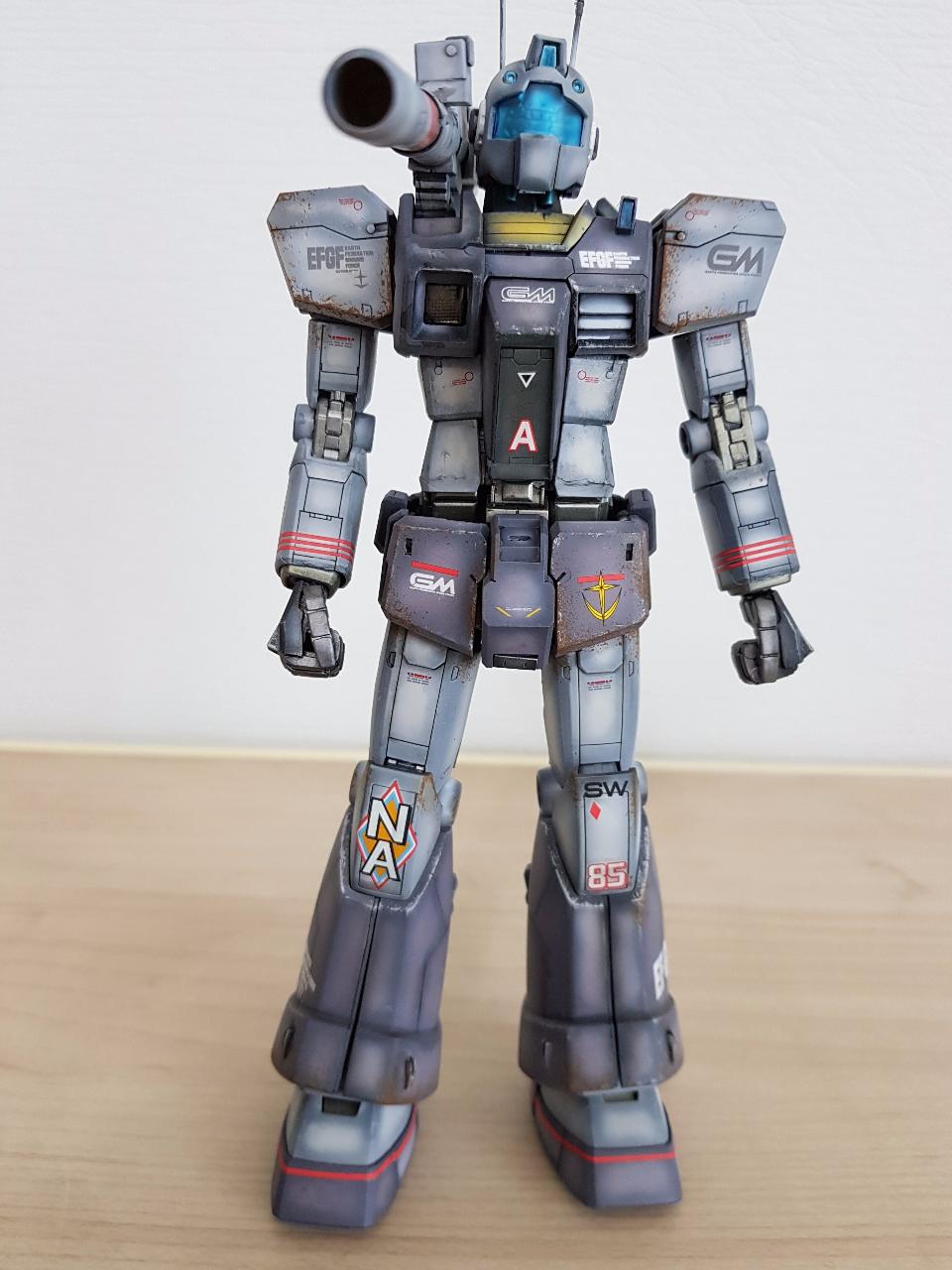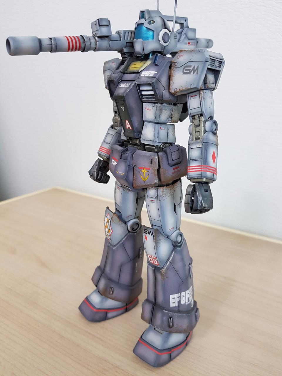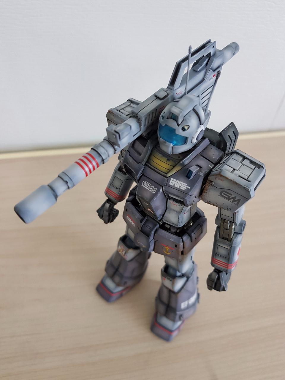 건담매니아들은 알겠지만 짐캐논은 '딱봐도' 건캐논의 간이 염가 양산형 버젼임을 알 수 있습니다. 단순한 디자인이라 그냥 만들면 단조로울 것 같아 레진 컨버젼 킷으로 디테일 업을 해줬습니다. 하지만 일반 짐과 짐캐논의 하체가 다름에도 컨버젼 킷 하체가 일반 짐과 동일한 모양이길래 무릎이하 하체는 킷 그대로 만들고 패널라인 과 각종 몰드를 추가하여 디테일을 살려봤습니다.