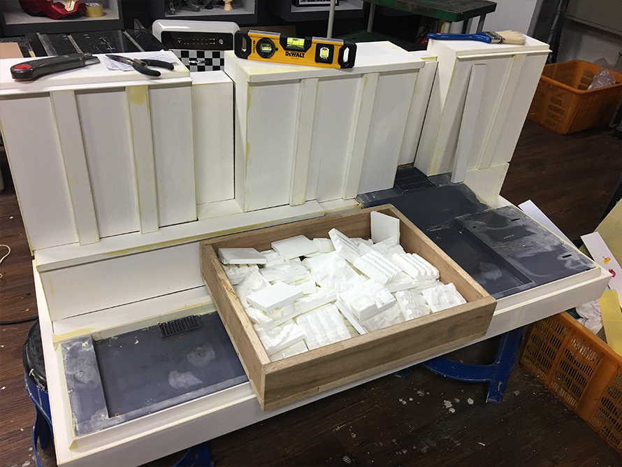 전체적인 구조물은 목공작업으로 이루어지고 이후 나무위에 포맥스로 스킨 작업을 해 주었습니다.