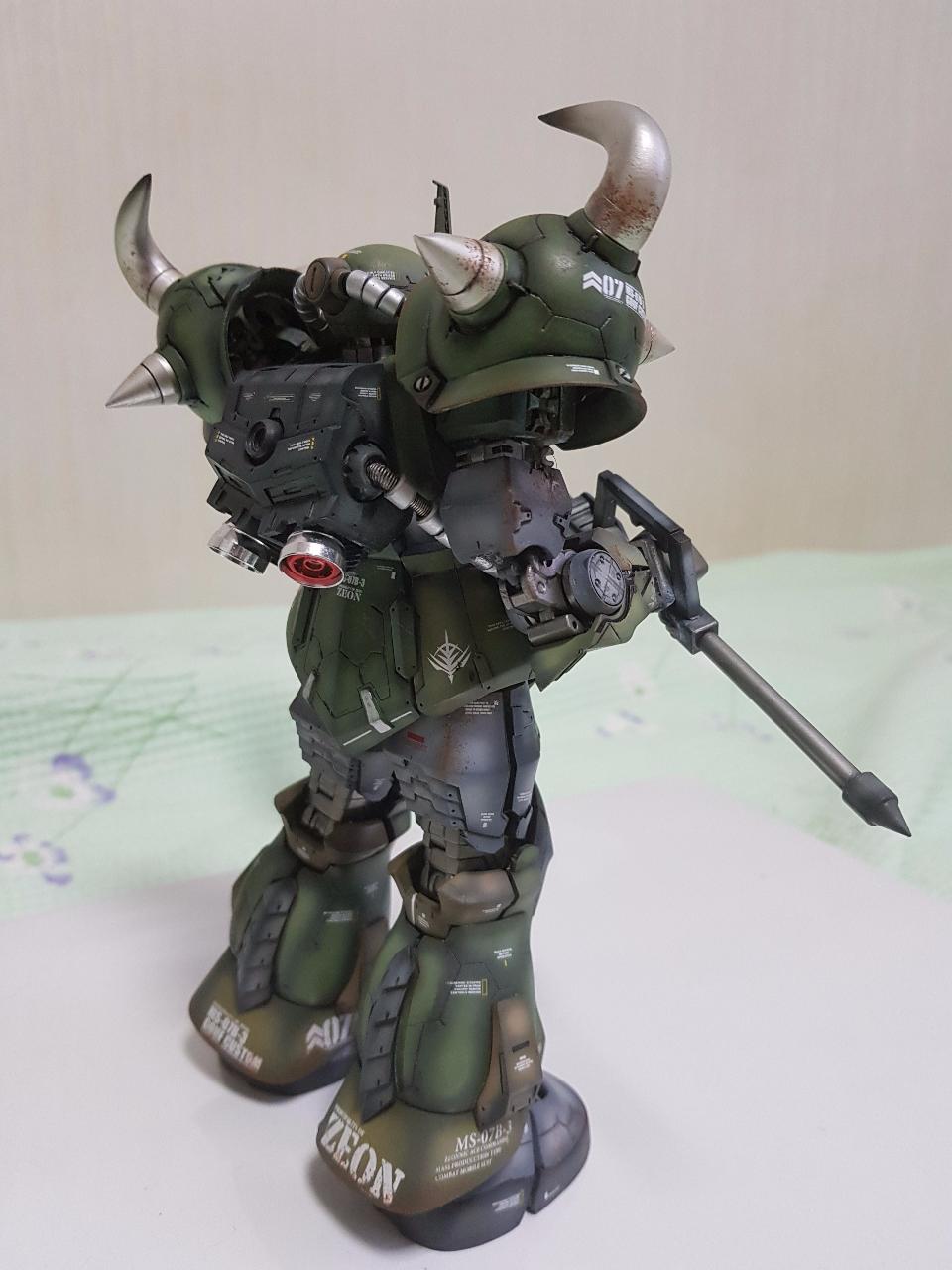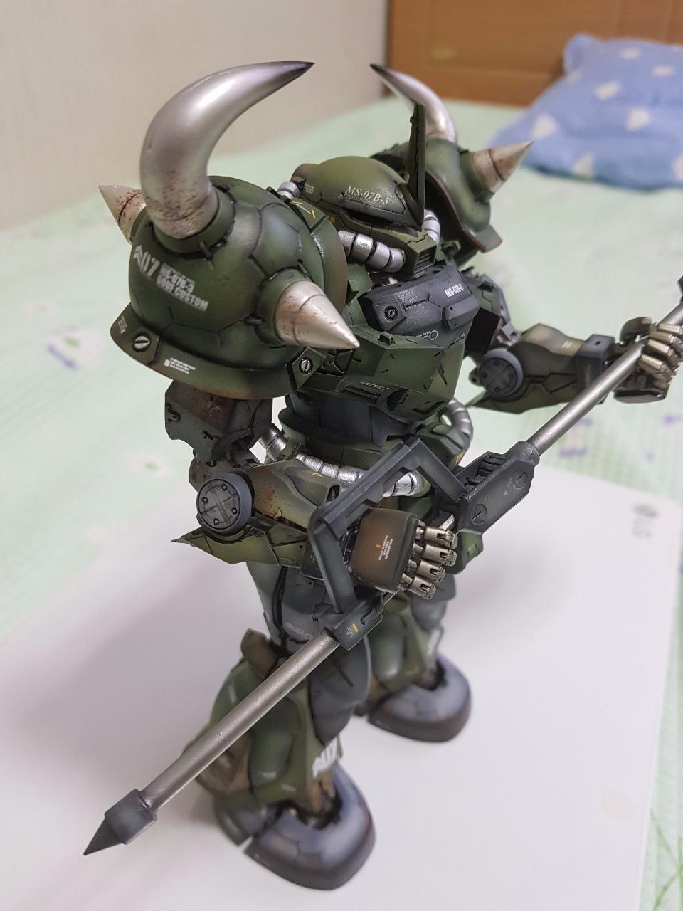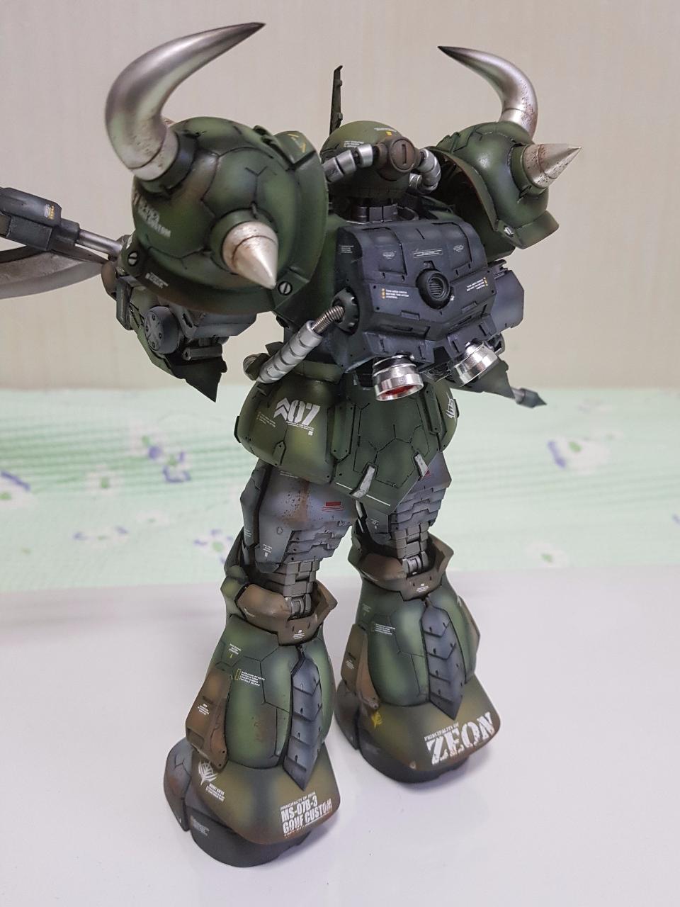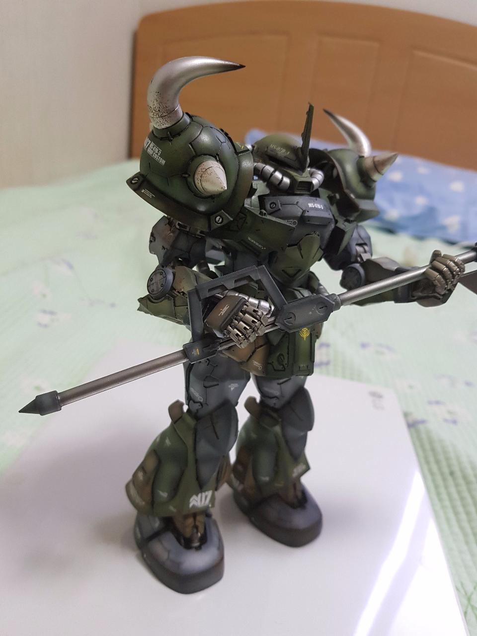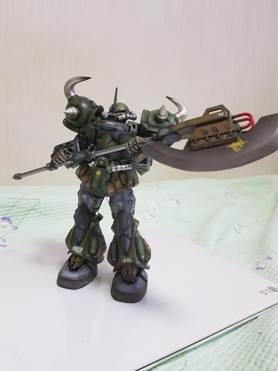 무장은 구프 커스텀의 상징인 쉴드캐틀링건 대신에 중국 사이드3사의 레진제 대형 히트호크를 선택했습니다. 박력있을 줄 알고 선택한것인데, 제작도중 팔이 부러져 순간접착제로 고정하는 과정에서 들고 있는 자세가 어정쩡해져 아쉬움이 남습니다.