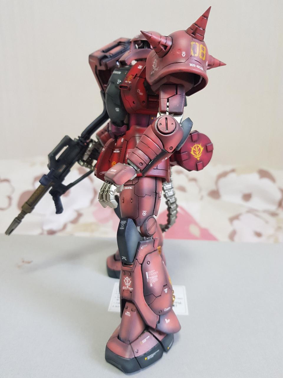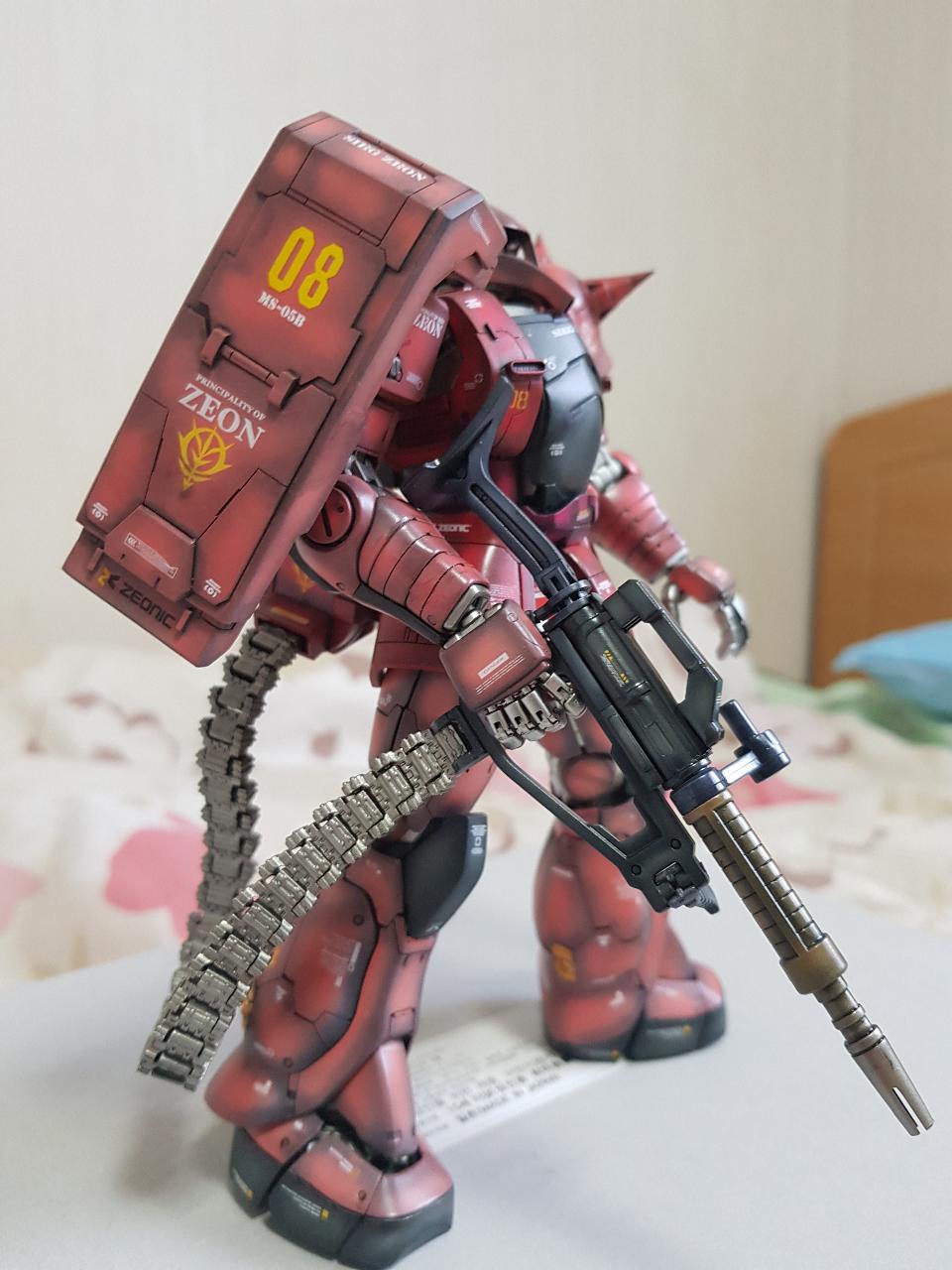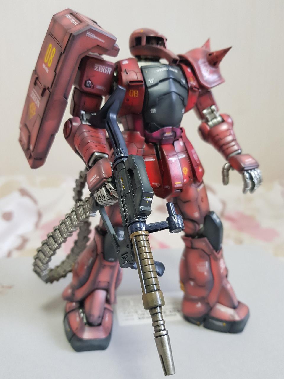 일반적인 자쿠1과 틀린 점은 양쪽 어깨 쉴드가 자쿠2스타일을 하고 있으며, 자쿠머신건도 탄창식이 아니라 탄띠 급탄식을 사용한다는 것입니다. 또한 어떤 이유인지는 모르지만 개인번호는 08을 사용하고 있으며, 샤아 특유의 독일군식 헬멧을 형상화한 퍼스널 마킹은 아직 사용하지 않고 있습니다.