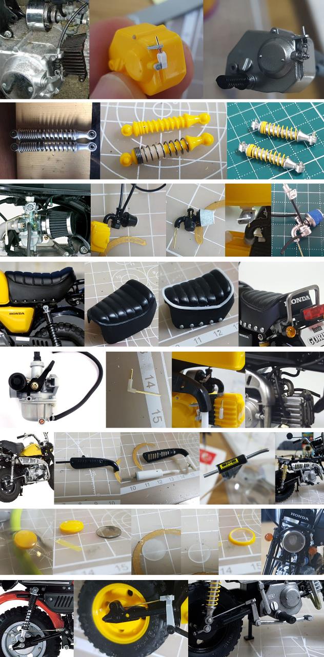 예전에 타던 에이프가 만들고 싶었는데 물건이 보이질않아 형제뻘인 고릴라를 만들어봤습니다. 미니 4행정 바이크로 9L의 대용량 연료탱크가 이쁜 바이크 입니다. 작업중간 보는 재미를 올려보려고 소소하게 디테일업을 했습니다.