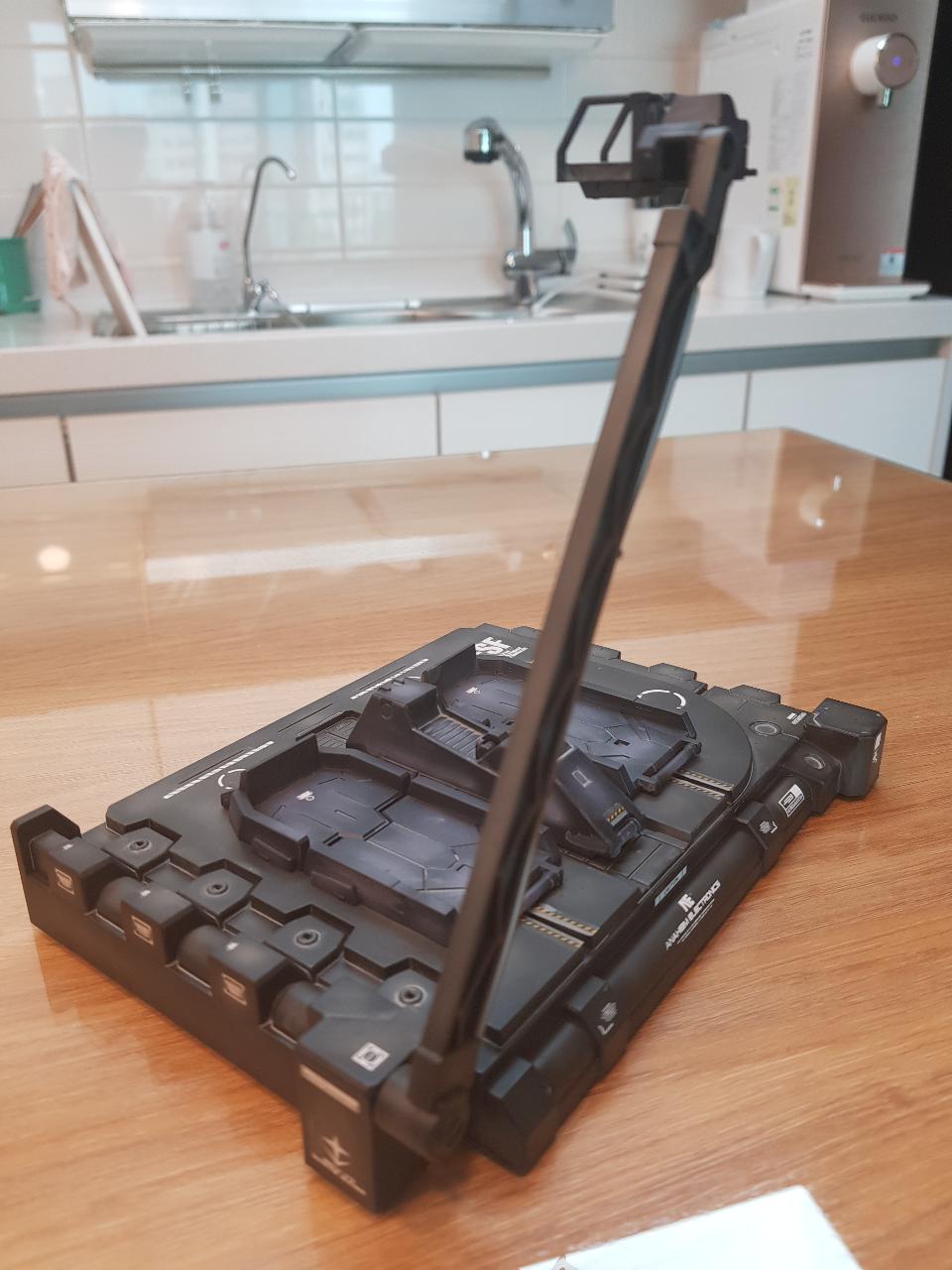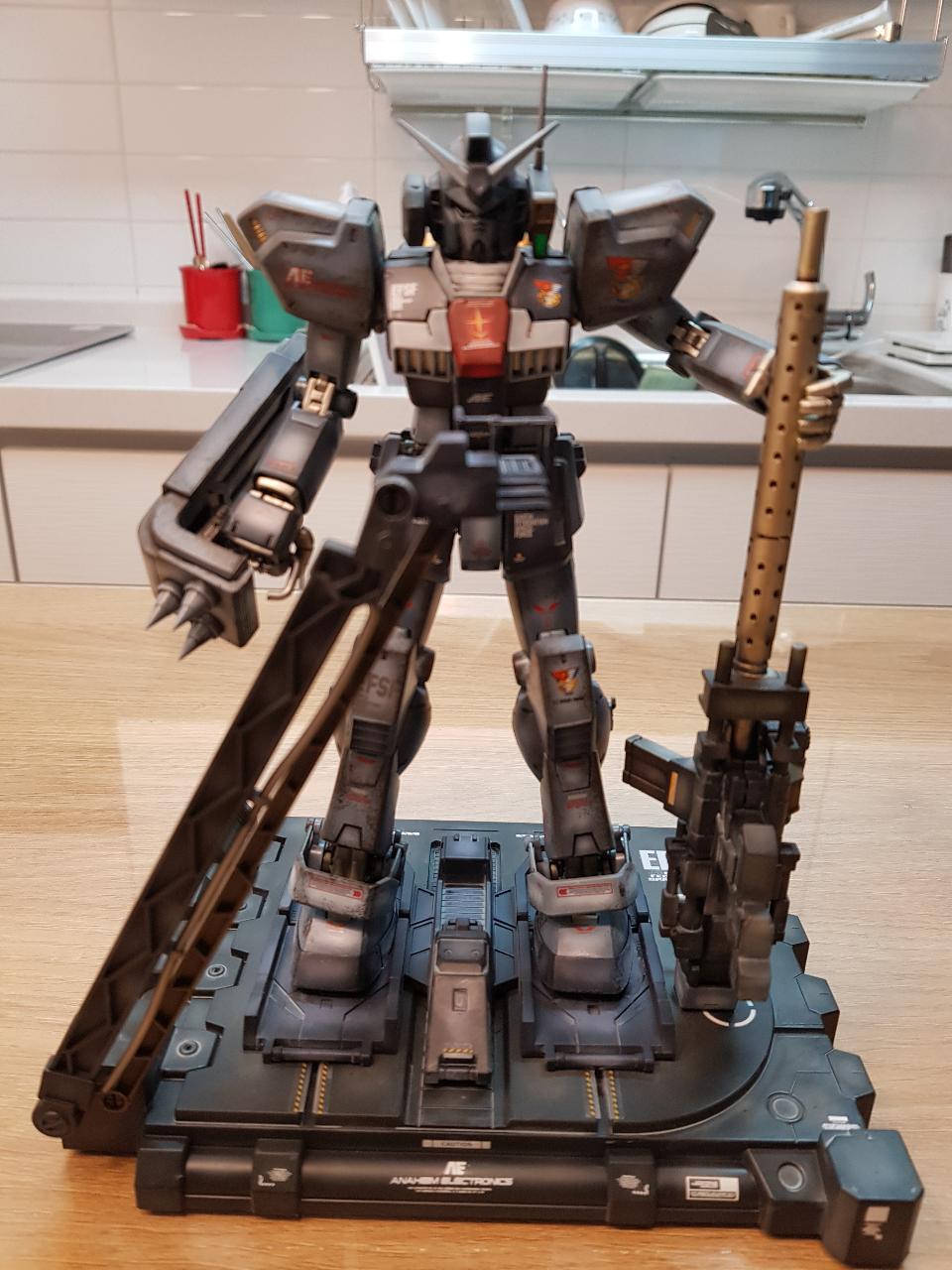 짐 스나이퍼 커스텀을 이용해 형식불명의 잡종건담을 만들어 보았습니다. 왼손잡이로 만들 생각은 없었는데, 받침대로 사용한 건담 마크2용 행거의 사다리 방향때문에 왼손잡이로 설정했습니다. 개조라봤자 대단한건 아니고, 지난 번 누벨짐3만들면서 남은 건담 마크2 부품 중 헤드와 어깨장갑을 이식했고, 쉴드는 자쿠1용을 사용했습니다. 라이플은 중국 직인장역제 HAR -1/2 라이플 키트를 사용했는데, 겉으로 화려한 모양과는 달리 런너 제조상태도 매우 엉성하고, 부품도 제대로 맞지 않았습니다. HAR-1이 스나이퍼 라이플이고, HAR-2가 기관포 형식인데, 스나이퍼 라이플이 비대하게 커서 어색하게 보이길래 기관포 형식의 라이플을 선택했습니다.