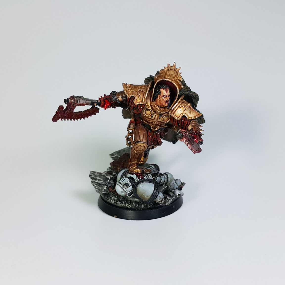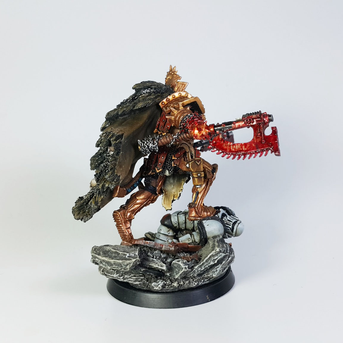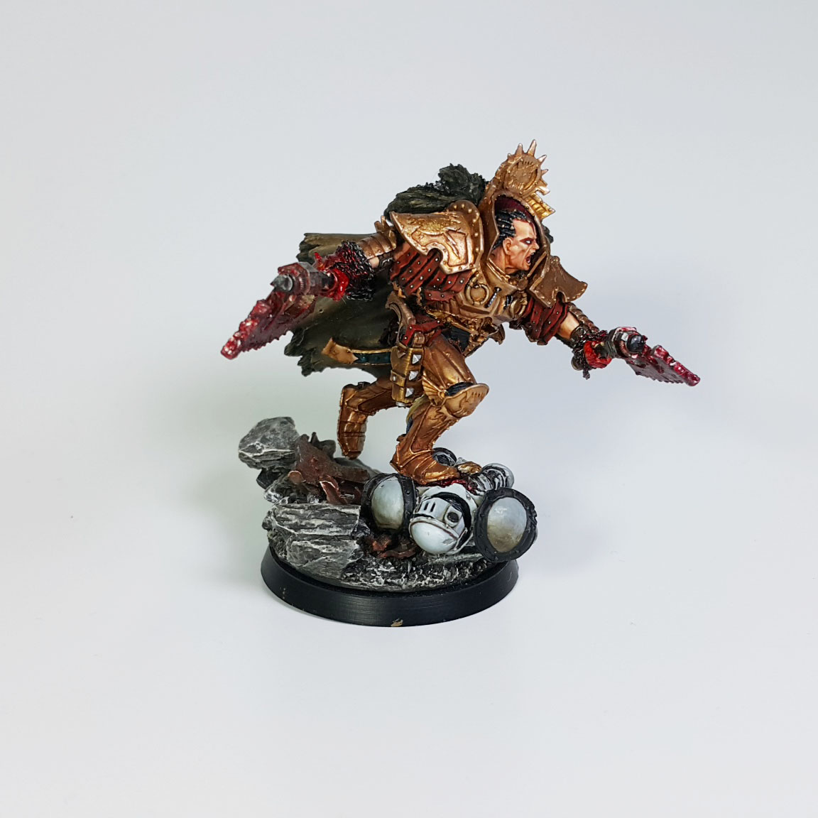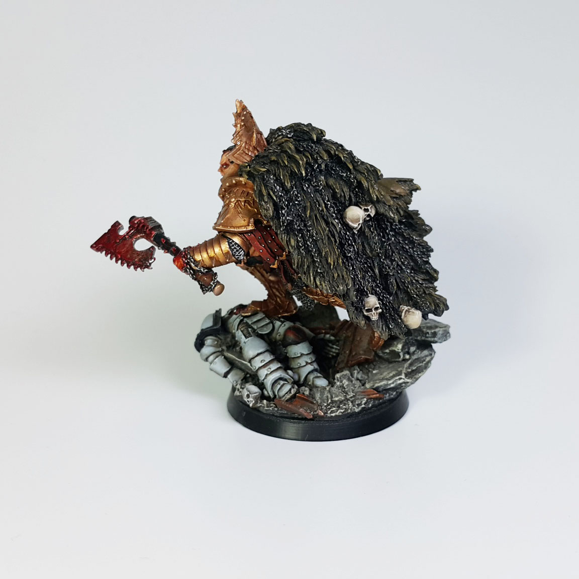 군단에 합류되기 전에 노예 검투장에서 투사로 부려졌다는 과거가 있습니다. 모형에서 마치 레게머리처럼 표현된 부분은 모두 머리에 박힌 Butcher's Nail의 케이블들인데, 이 장비는 사용자의 뇌에 직접적으로 영향을 주어 전투와 유혈에 대한 충동을 극대화한다고 합니다.