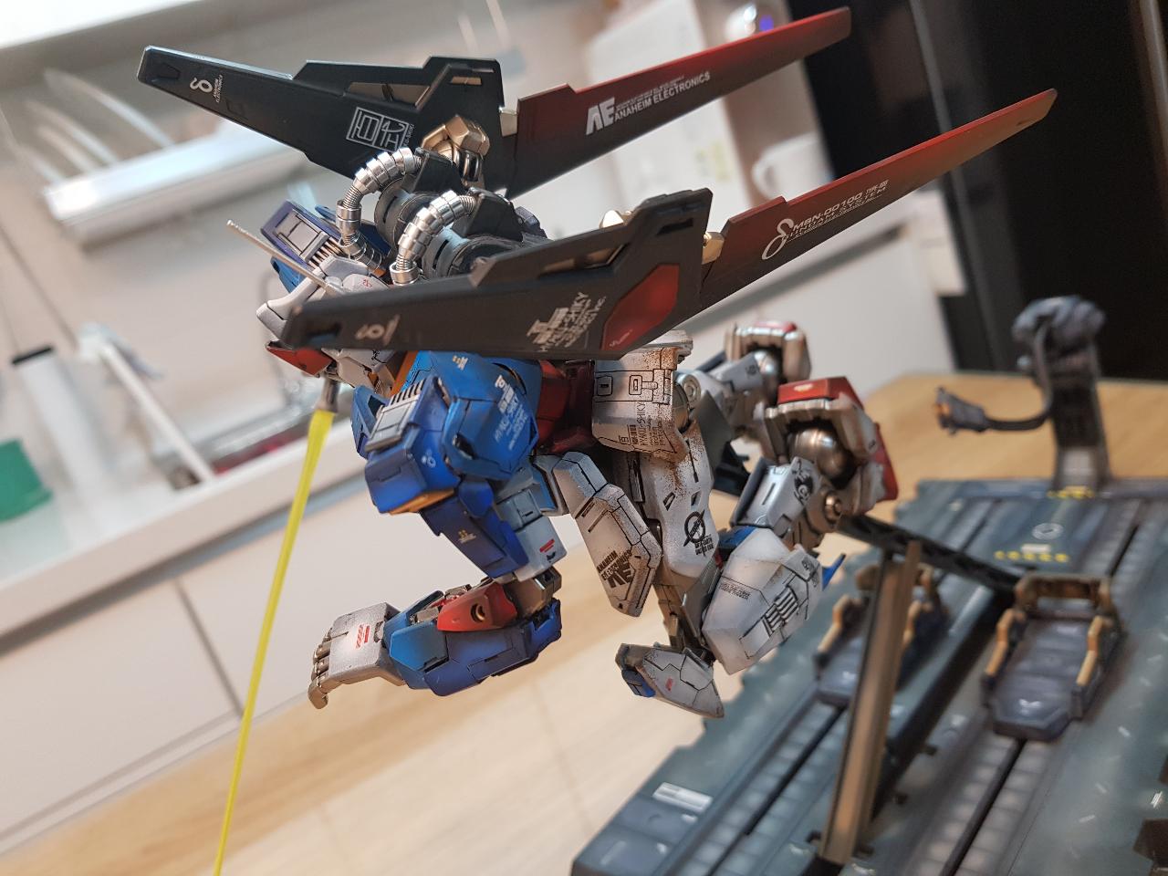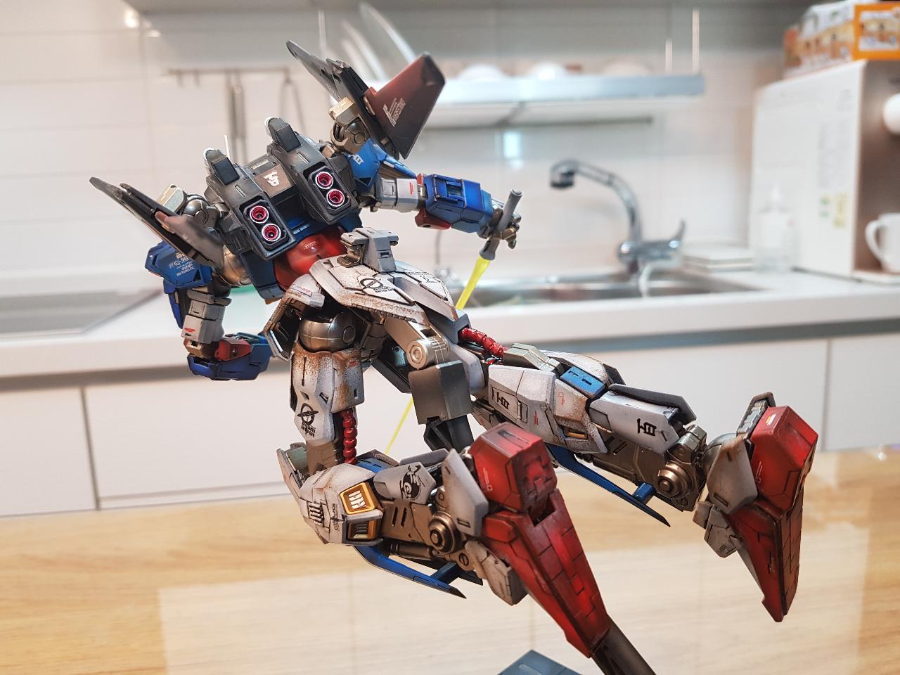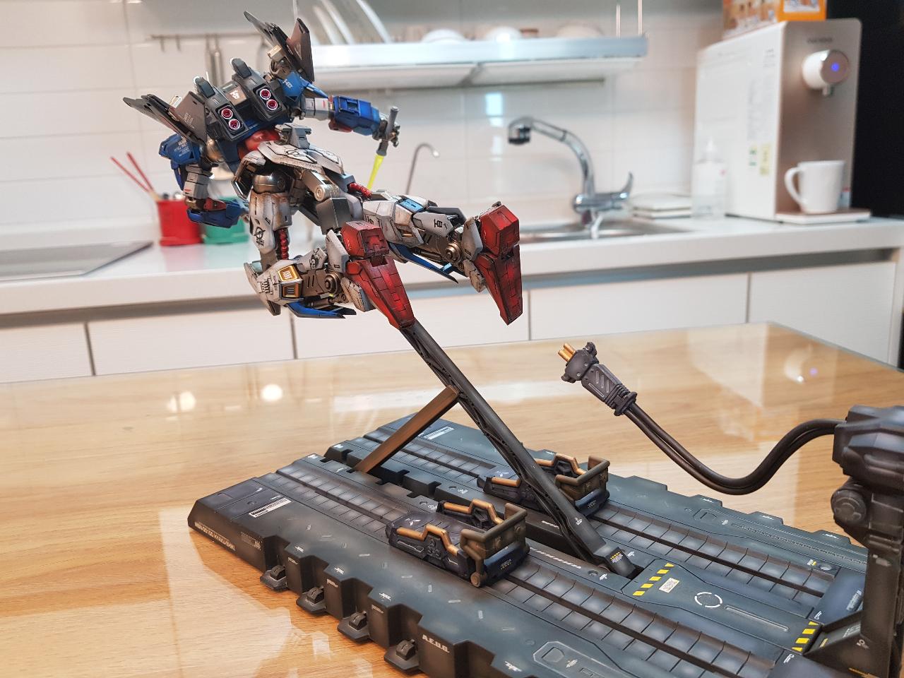 원래 킷은 애니매이션 설정대로 금색을 표현하기 위해 금색맥기처리가 되어있었는데, 개인적으로 금색이 맘에 들지않아 Z건담과 유사한 색상으로 도색하였습니다. 별도로 도색하기 위해 일부부품을 트래펑으로 벗겨내었습니다. 대부분 외부장갑은 사이드3제 리캐스트된 레진부품을 사용했습니다. 런처 베이스는 백식의 모함인 아가마를 묘사하기 위해 도색및 데칼을 붙였습니다. 런처베이스 모양을 봐서는 SEED계열 전용같아보였으나 크게 신경쓰지 않았습니다.