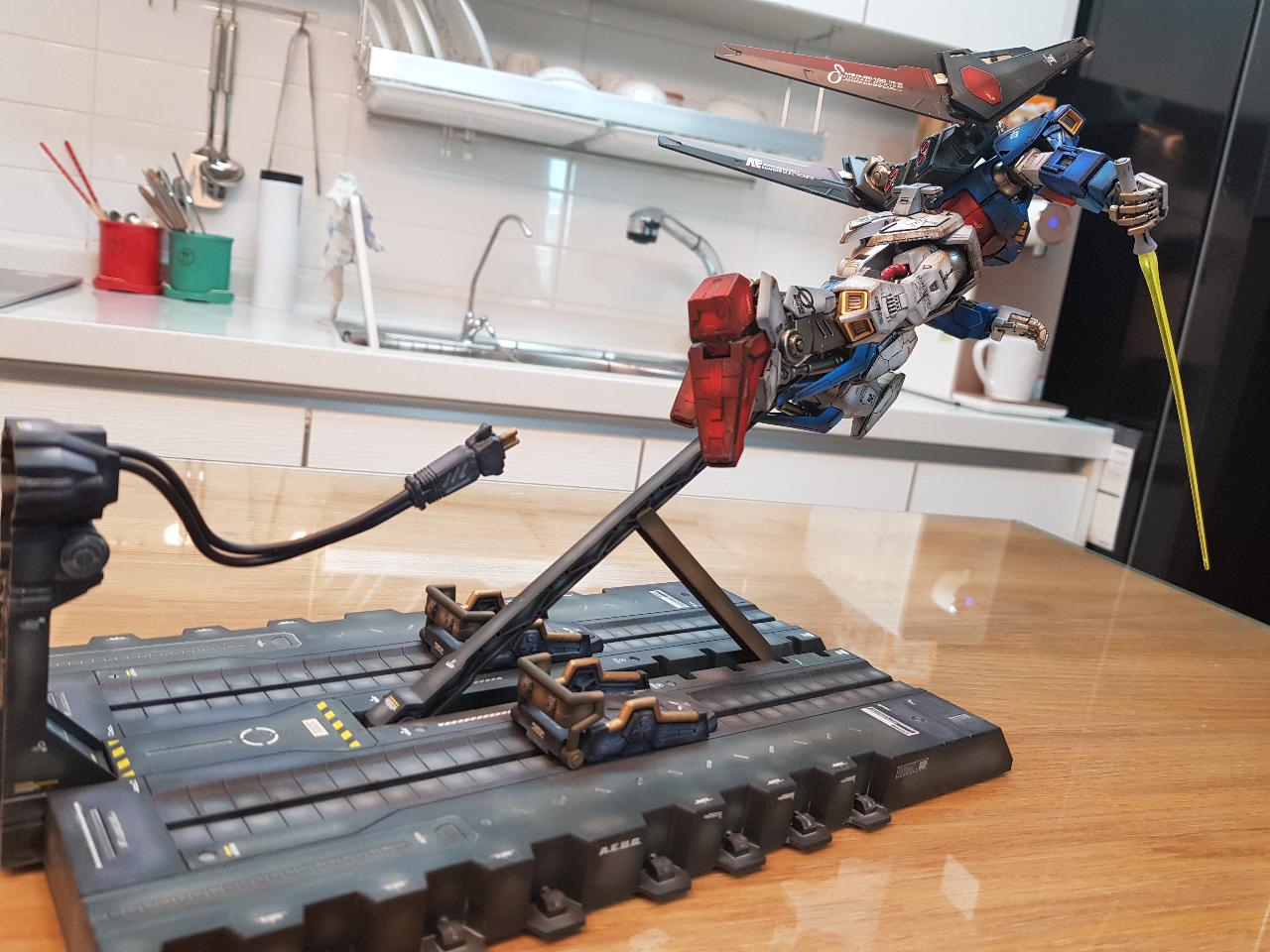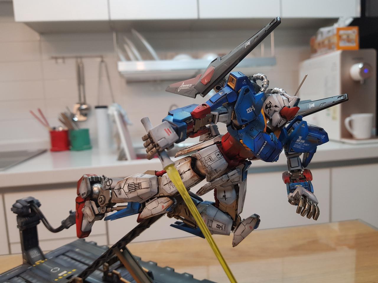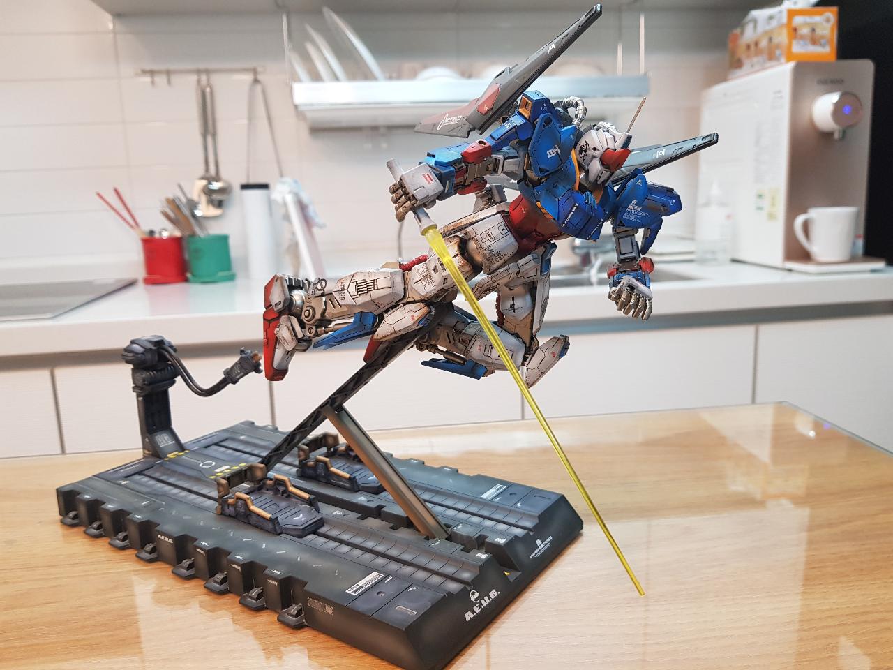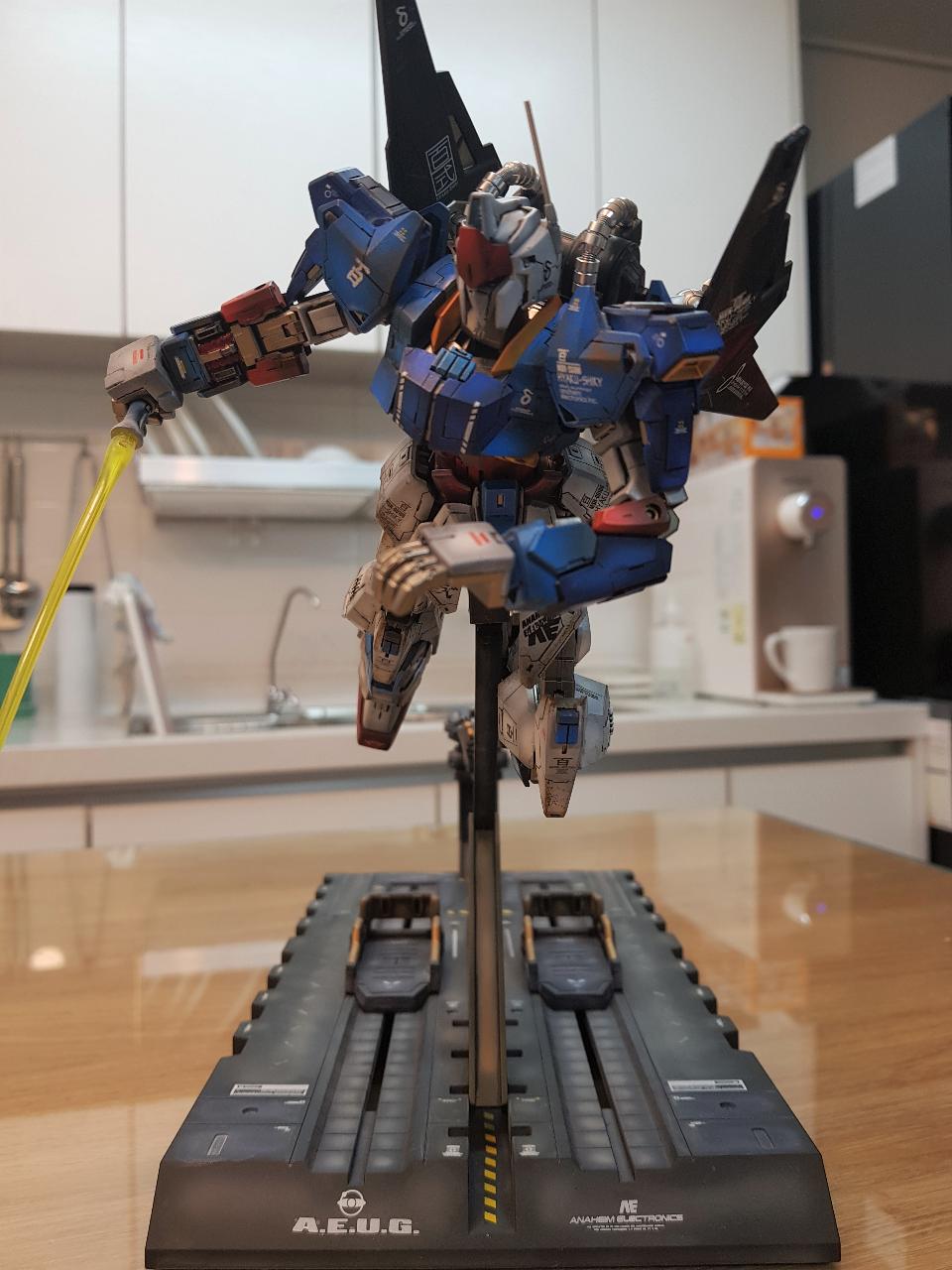원래 킷은 애니매이션 설정대로 금색을 표현하기 위해 금색맥기처리가 되어있었는데, 개인적으로 금색이 맘에 들지않아 Z건담과 유사한 색상으로 도색하였습니다. 별도로 도색하기 위해 일부부품을 트래펑으로 벗겨내었습니다. 대부분 외부장갑은 사이드3제 리캐스트된 레진부품을 사용했습니다. 런처 베이스는 백식의 모함인 아가마를 묘사하기 위해 도색및 데칼을 붙였습니다. 런처베이스 모양을 봐서는 SEED계열 전용같아보였으나 크게 신경쓰지 않았습니다.