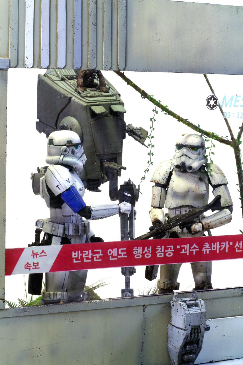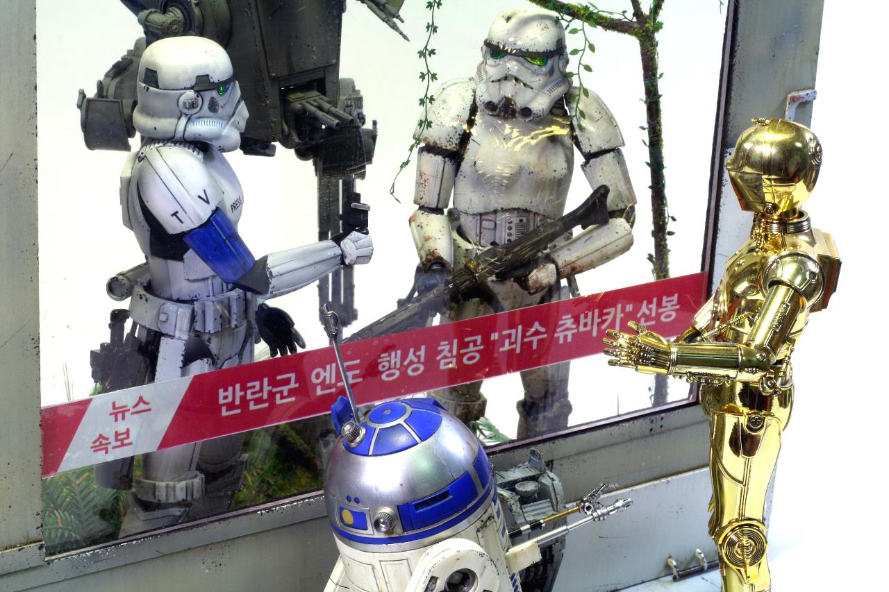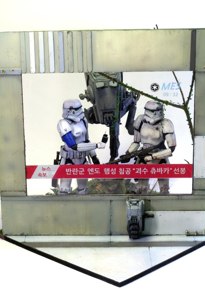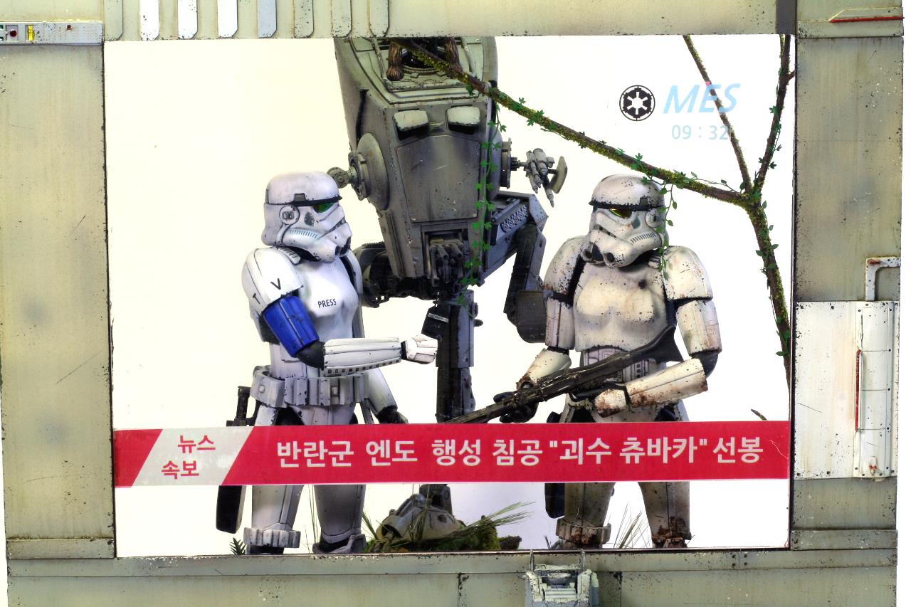 엔도행성을 침공한 반란군과 교전을 벌이는 제국군 스토미를 다른 스토미가 인터뷰하는 뉴스 화면인데요,이 뉴스를 또~ 알투와 쓰리피오가 티비에서 보는 액자구성 이에요~~