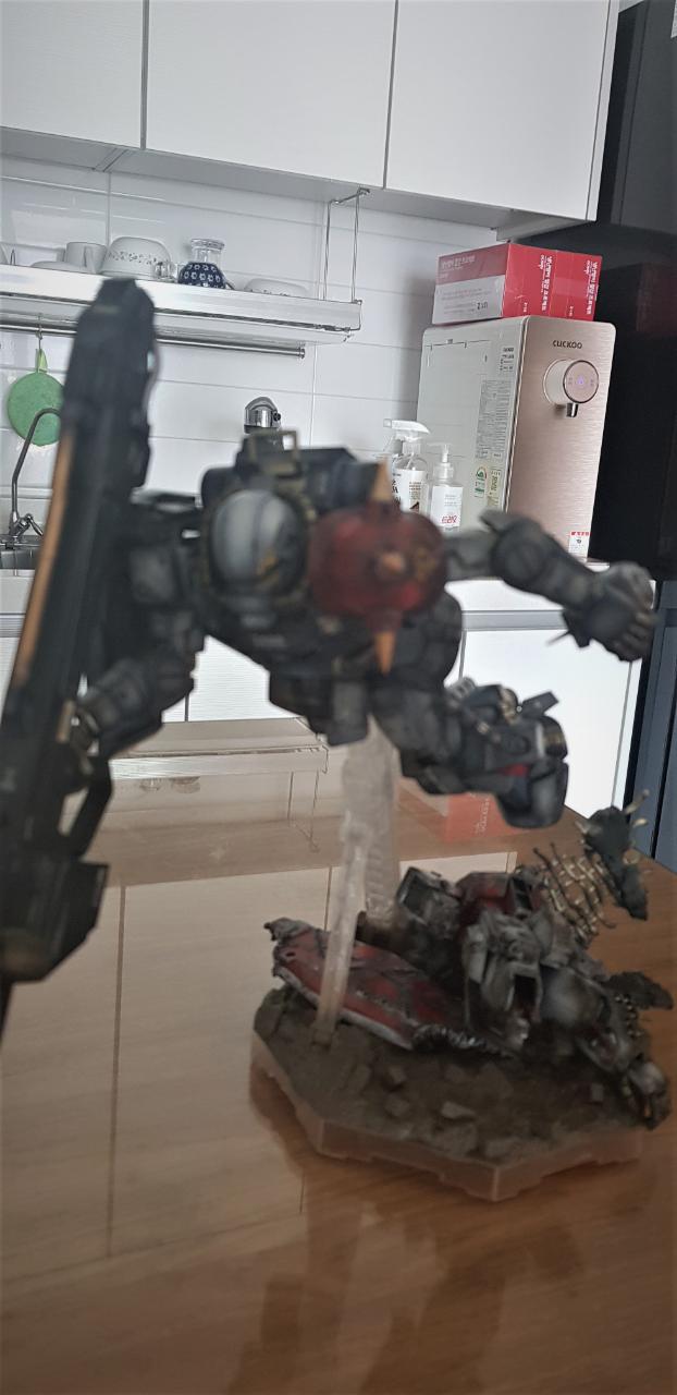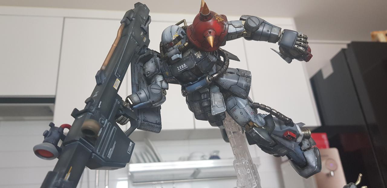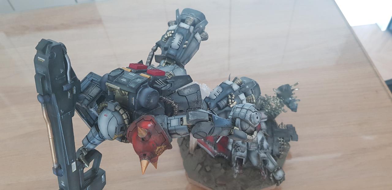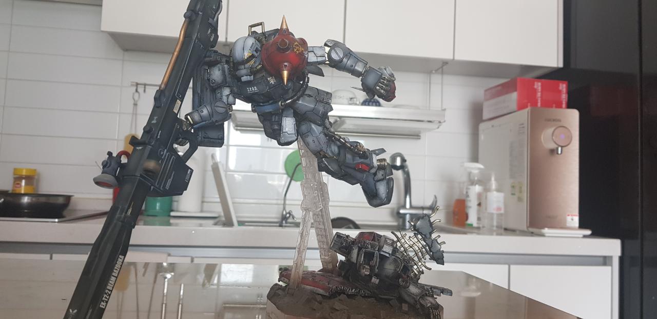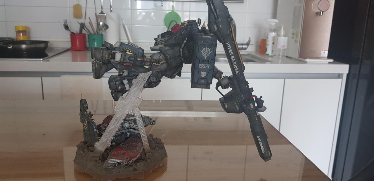 MG고기동 자쿠2를 만들어 봤습니다. 디테일이 좋은 레진 컨버젼 킷으로 외장을 바꿨고, 바주카도 릭돔용 빔바주카로 교체했는데, 생각보다 커서 언밸런스한 것 같습니다. 색상은 회색계열로 IPP락카를 사용했고, 데칼은 반다이와 기타 사제데칼을 섞어 사용했습니다. 허리/다리 동력선은 메탈재질로 교체했고, 머리 동력선은 그냥 사용했는데, 대신 색상을 허리동력선과 비슷한 건메칼로 도색했습니다. 베이스는 항상 하듯 액션베이스를 활용해 간단한 비네트 형식으로 꾸ㅕ주었고, 예전에 만들고 남은 GM계열 부푸으로 파손된 GM을 만들고 헤드는 자쿠손에 쥐어주었습니다.